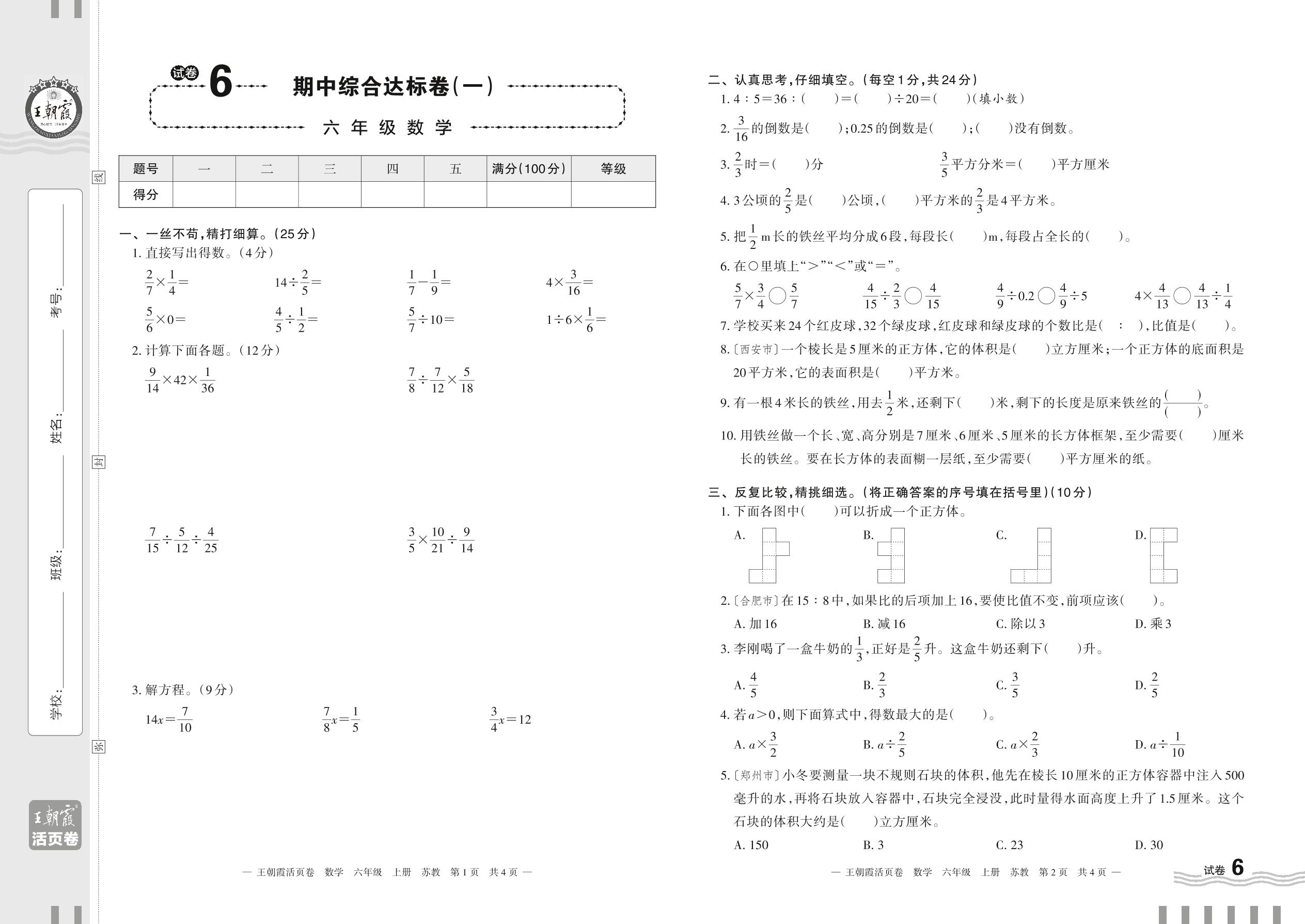 2023上册六年级数学苏教版 试卷6 期中综合达标卷(一)