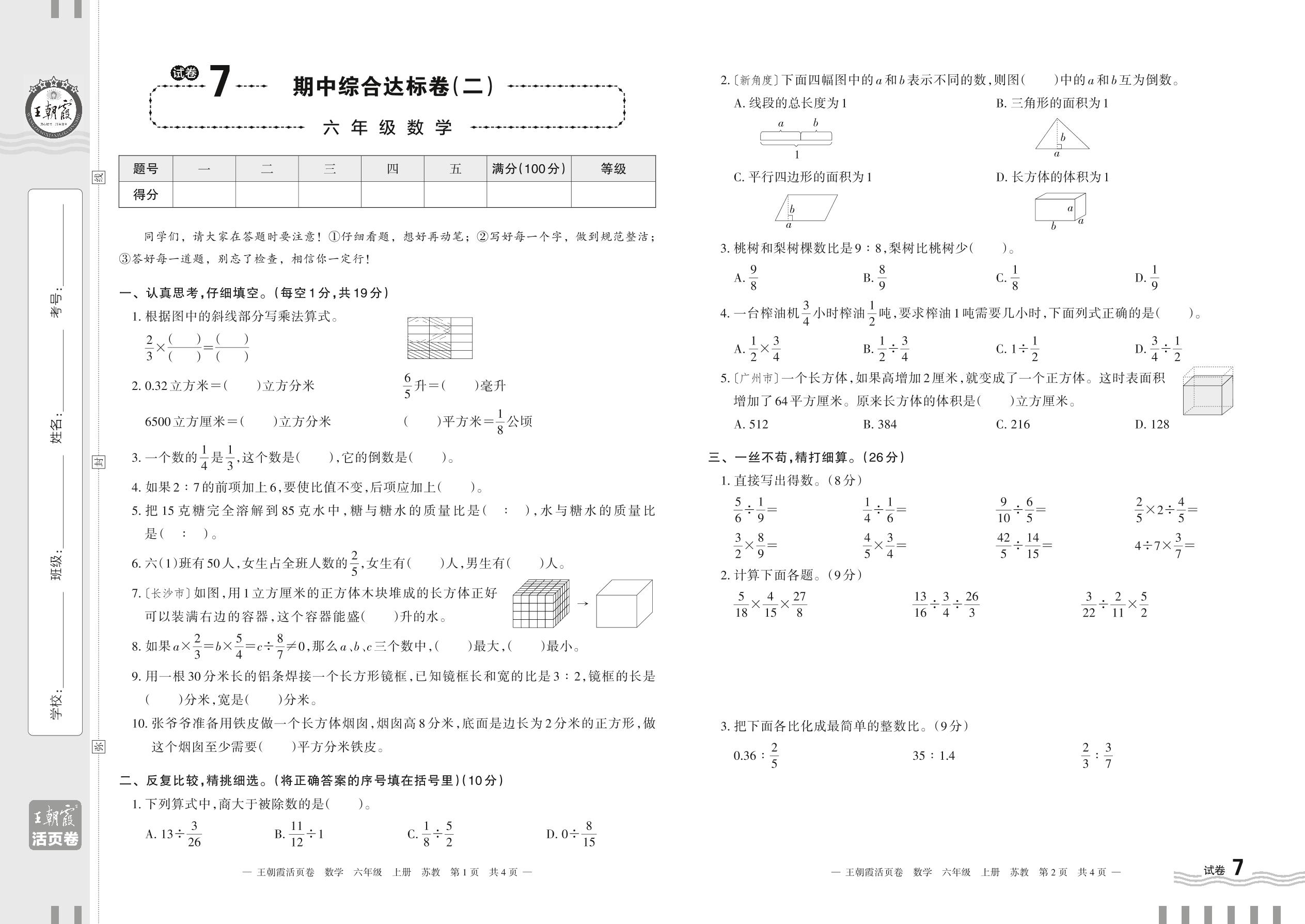 2023上册六年级数学苏教版 试卷7 期中综合达标卷(二)