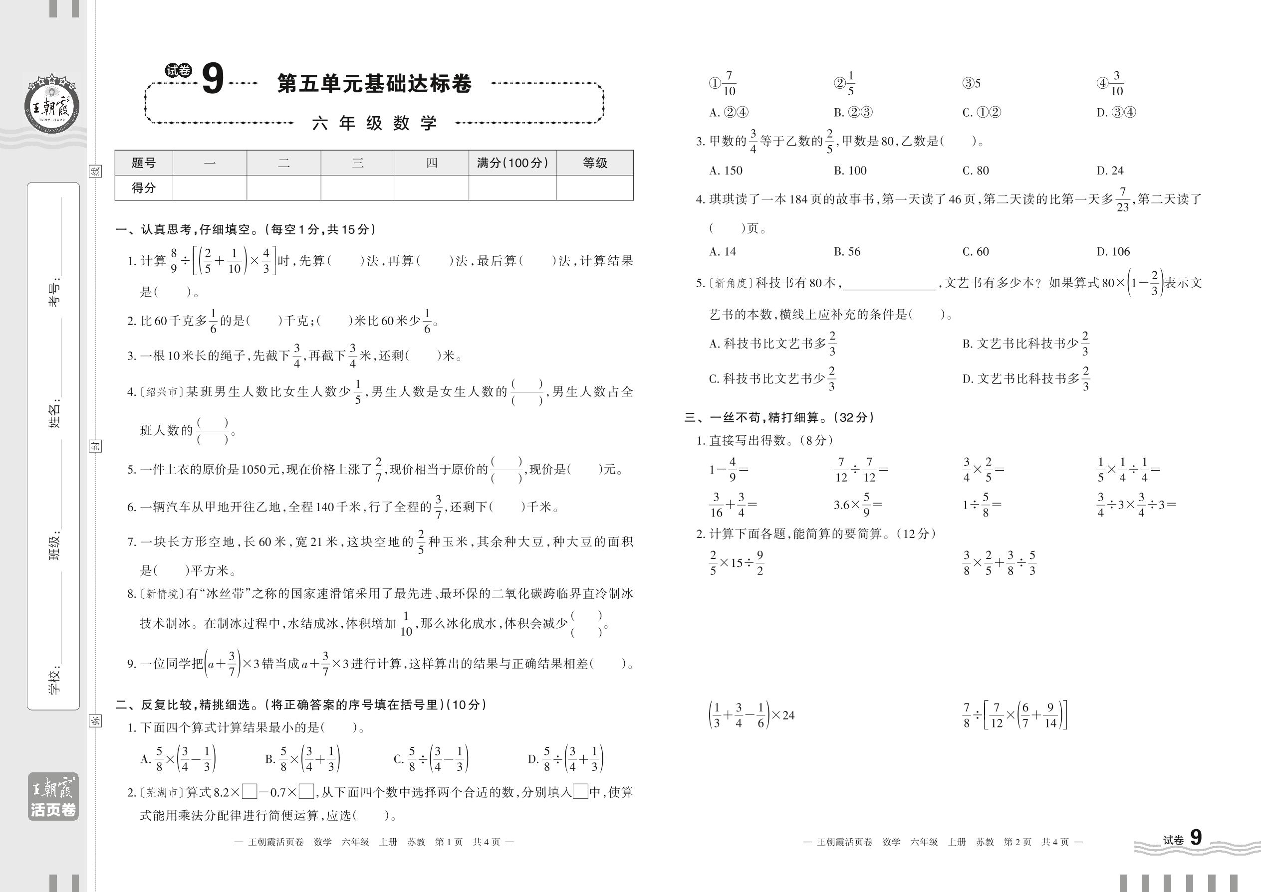 2023上册六年级数学苏教版 试卷9 第五单元基础达标卷