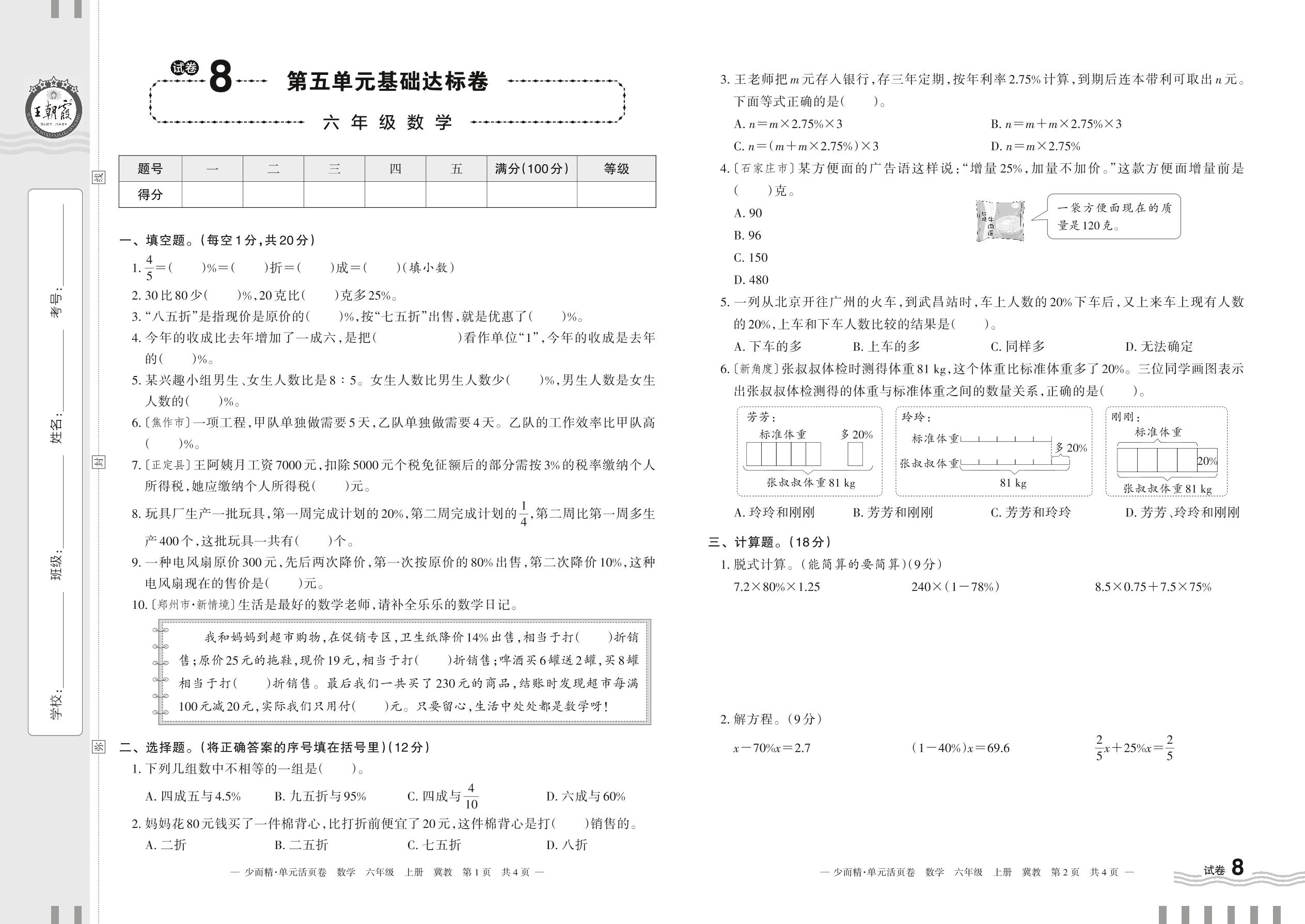 2023上册六年级数学冀教版 试卷8 第五单元基础达标卷