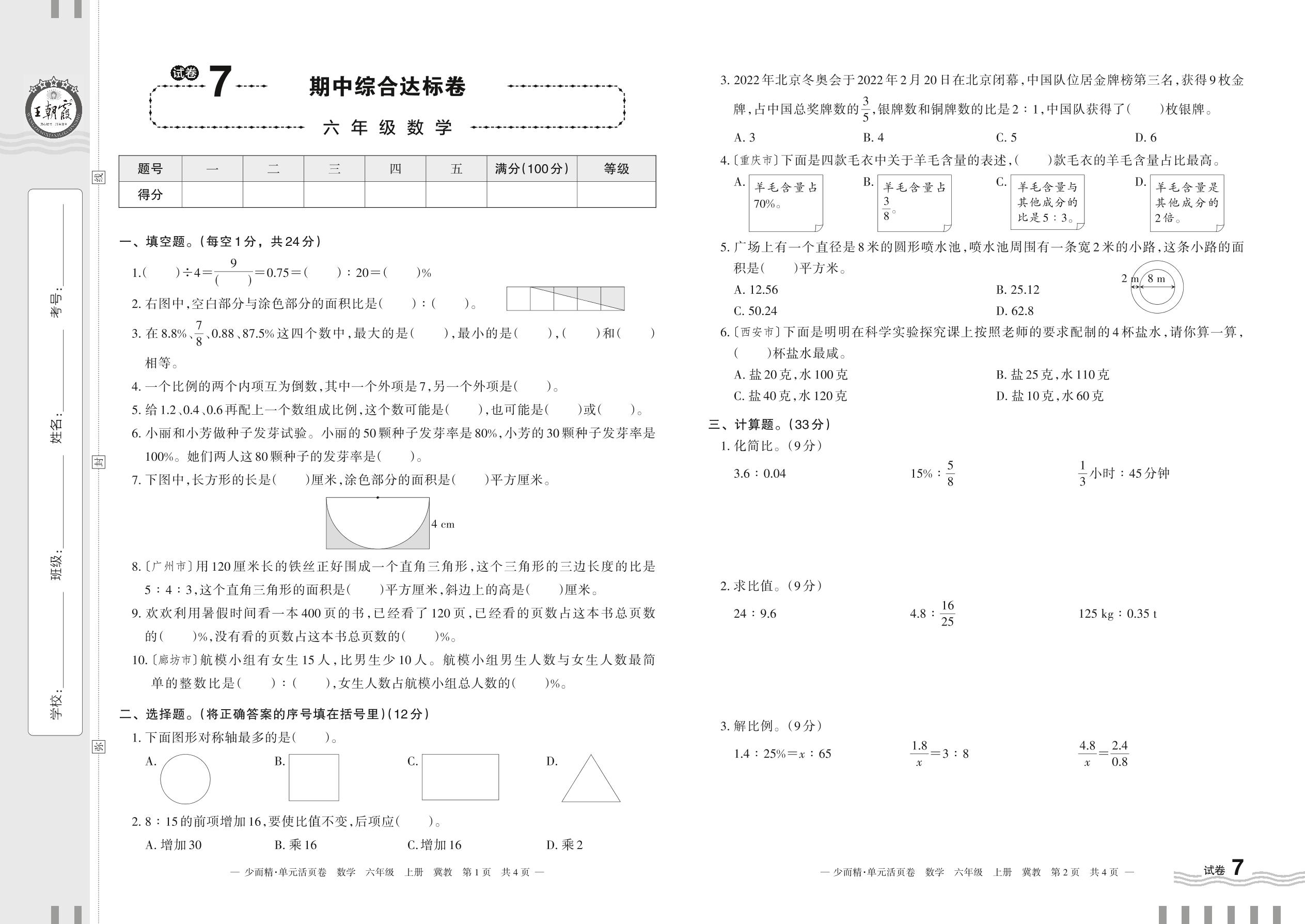 2023上册六年级数学冀教版 试卷7 期中综合达标卷