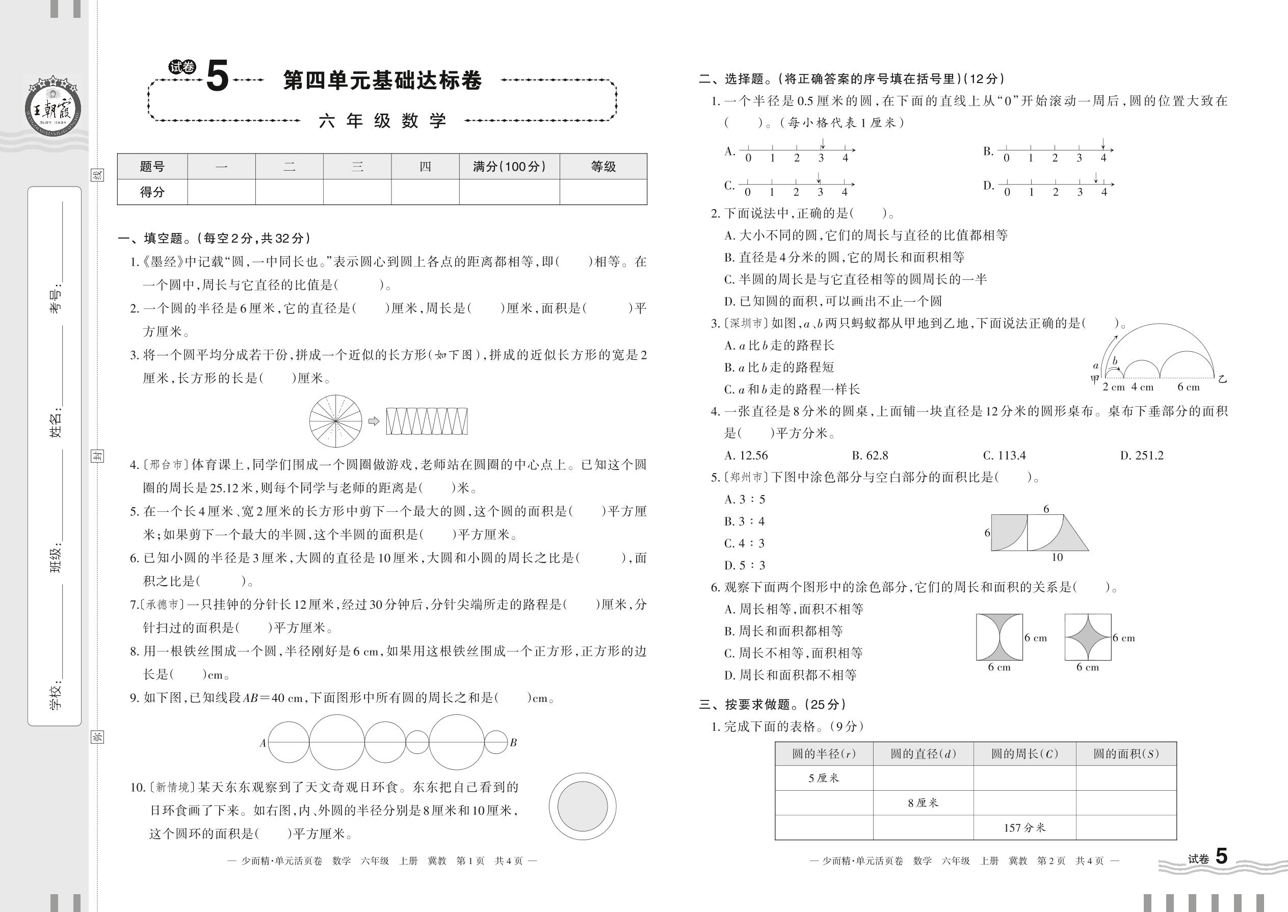 2023上册六年级数学冀教版 试卷5 第四单元基础达标卷