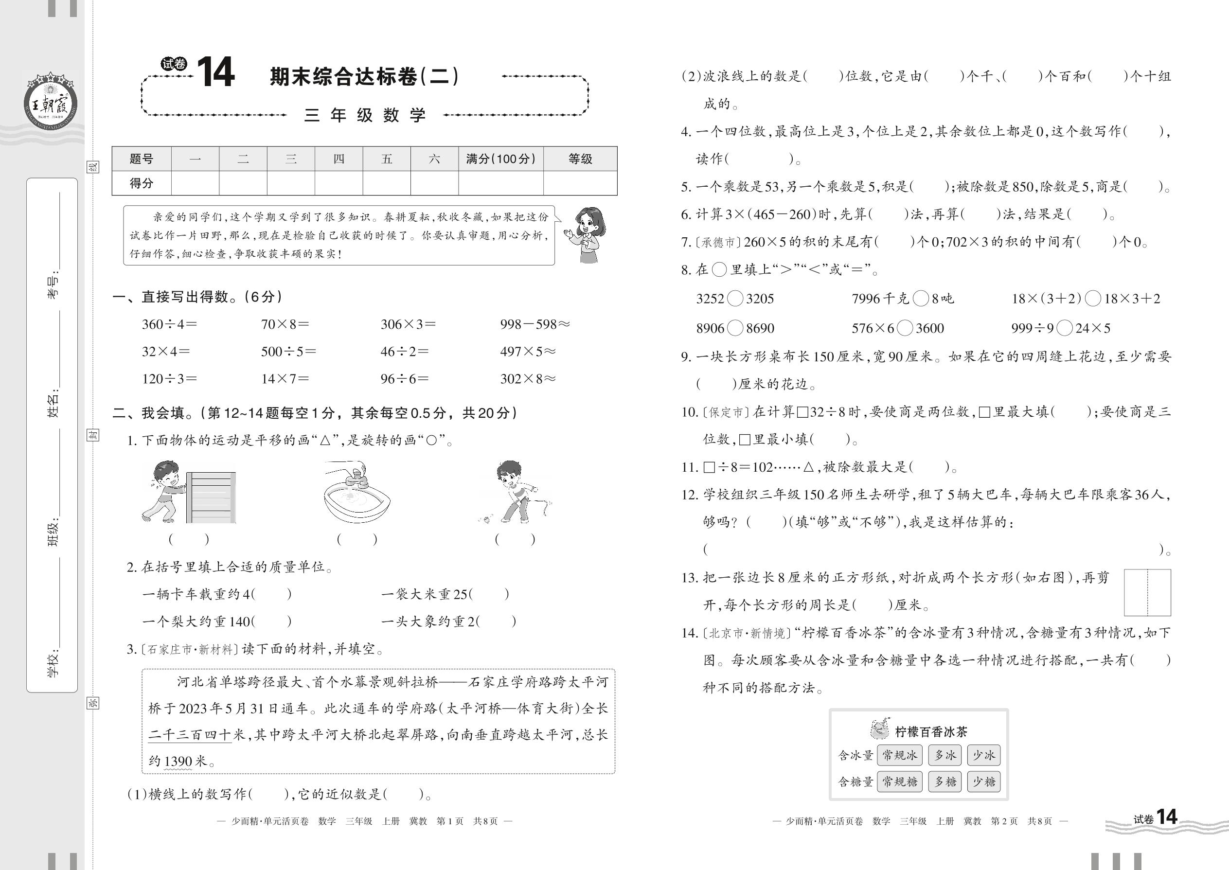 2023上册三年级数学冀教版 试卷14 期末综合达标卷(二)