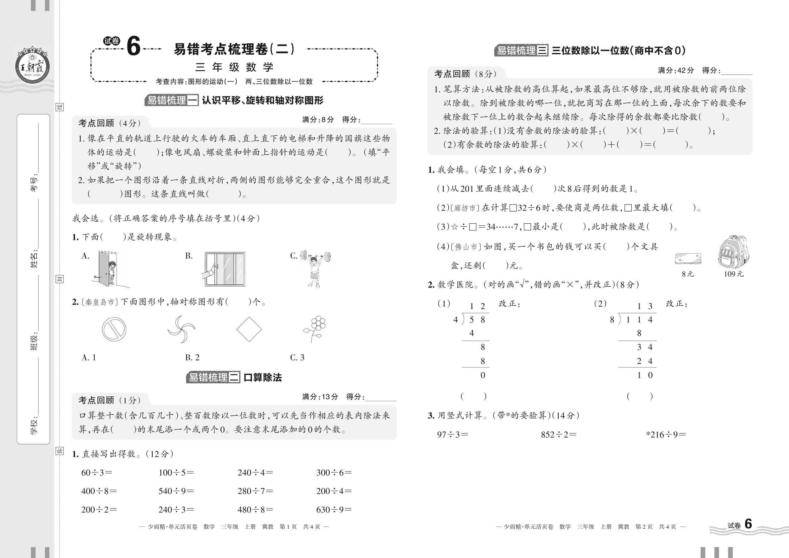 2023上册三年级数学冀教版 试卷6 易错考点梳理卷(二)