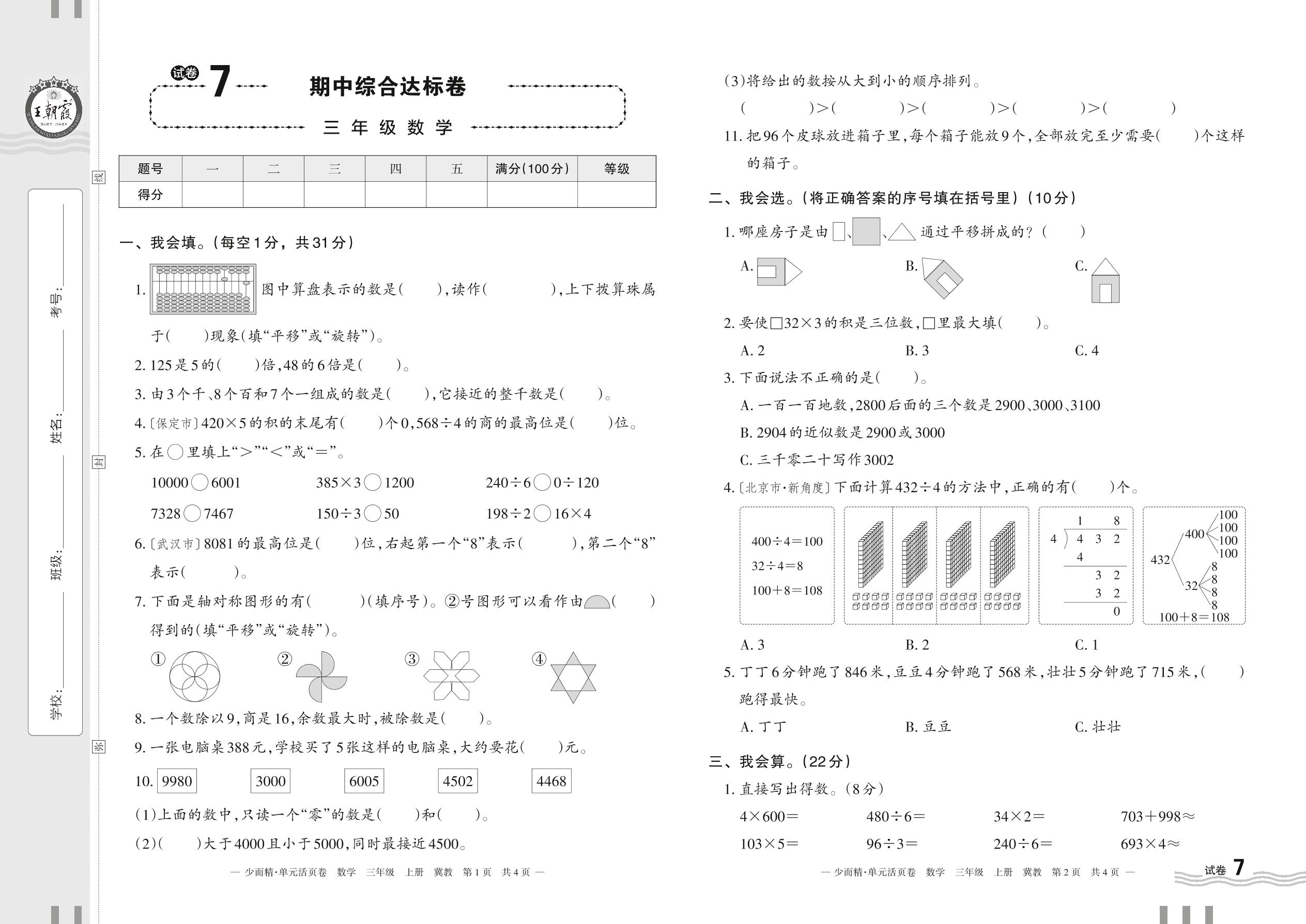 2023上册三年级数学冀教版 试卷7 期中综合达标卷
