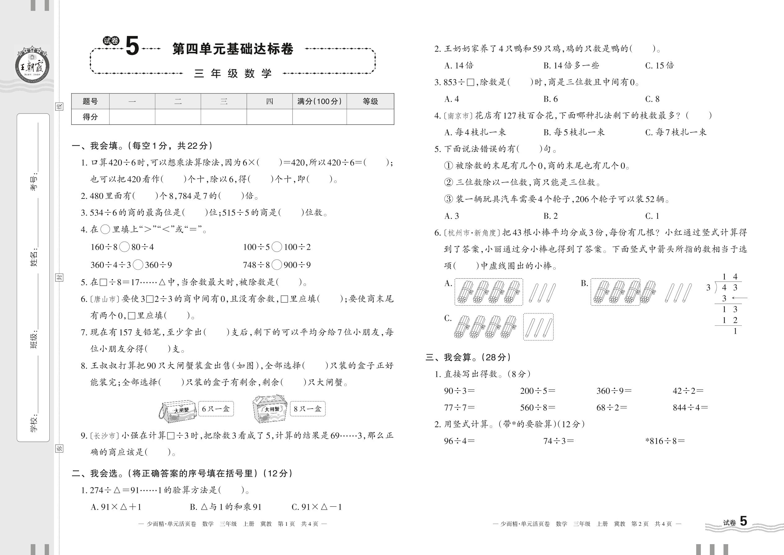 三年级数学冀教版上册单元卷