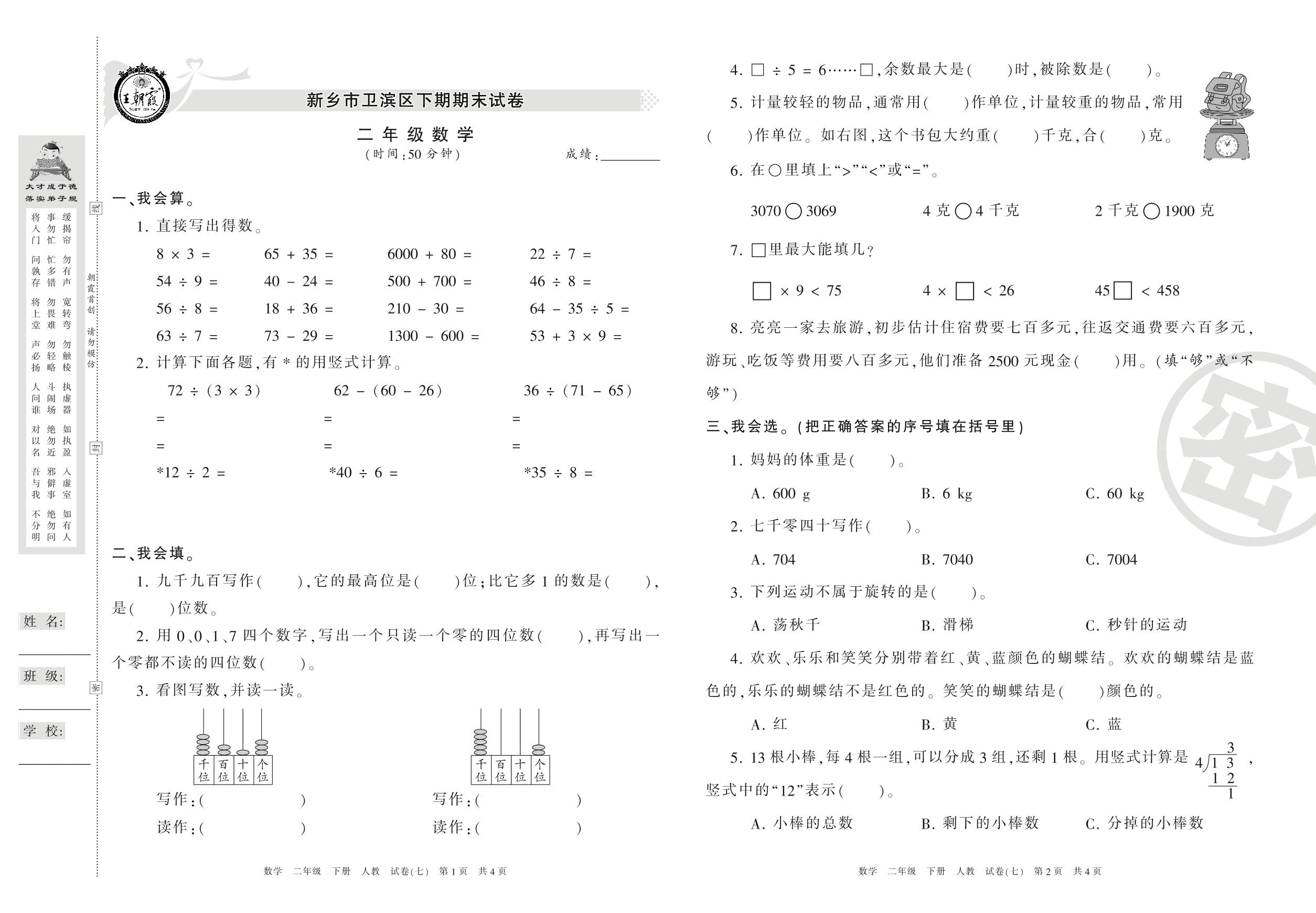 2015-2016学年第二学期新乡市卫滨区二年级数学试卷(人教版)【7】