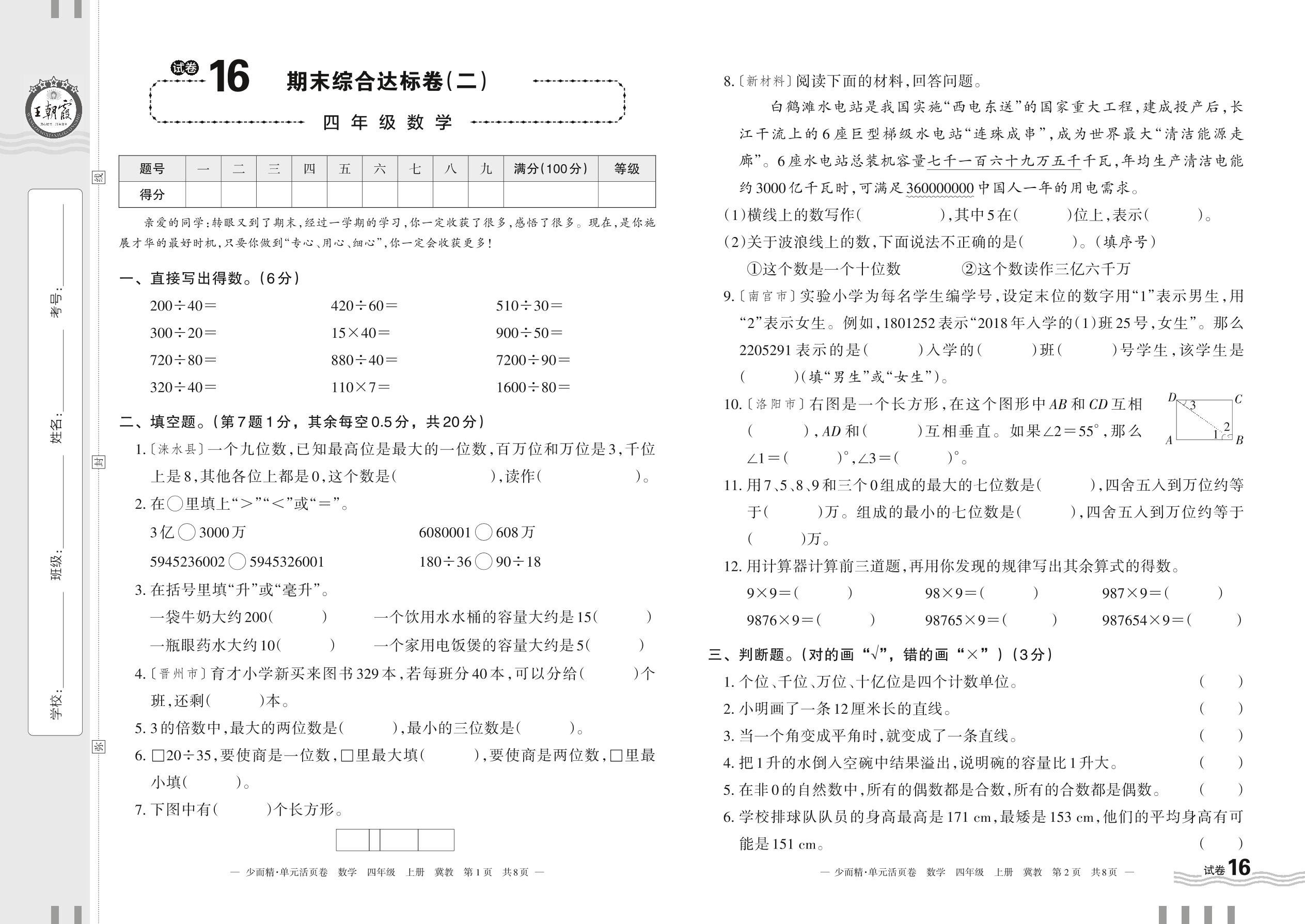 2023上册四年级数学冀教版 试卷16 期末综合达标卷(二)