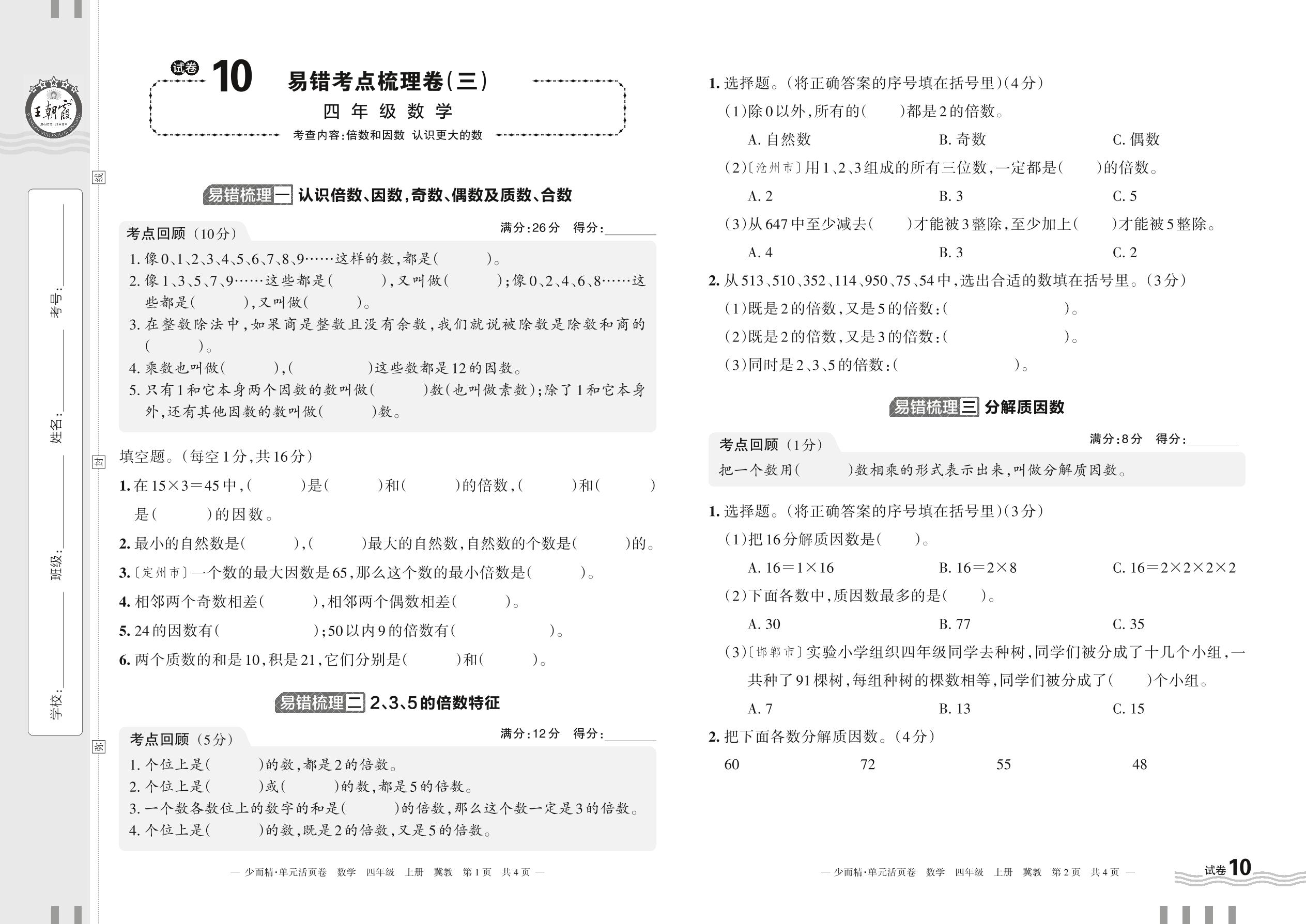 2023上册四年级数学冀教版 试卷10 易错考点梳理卷(三)