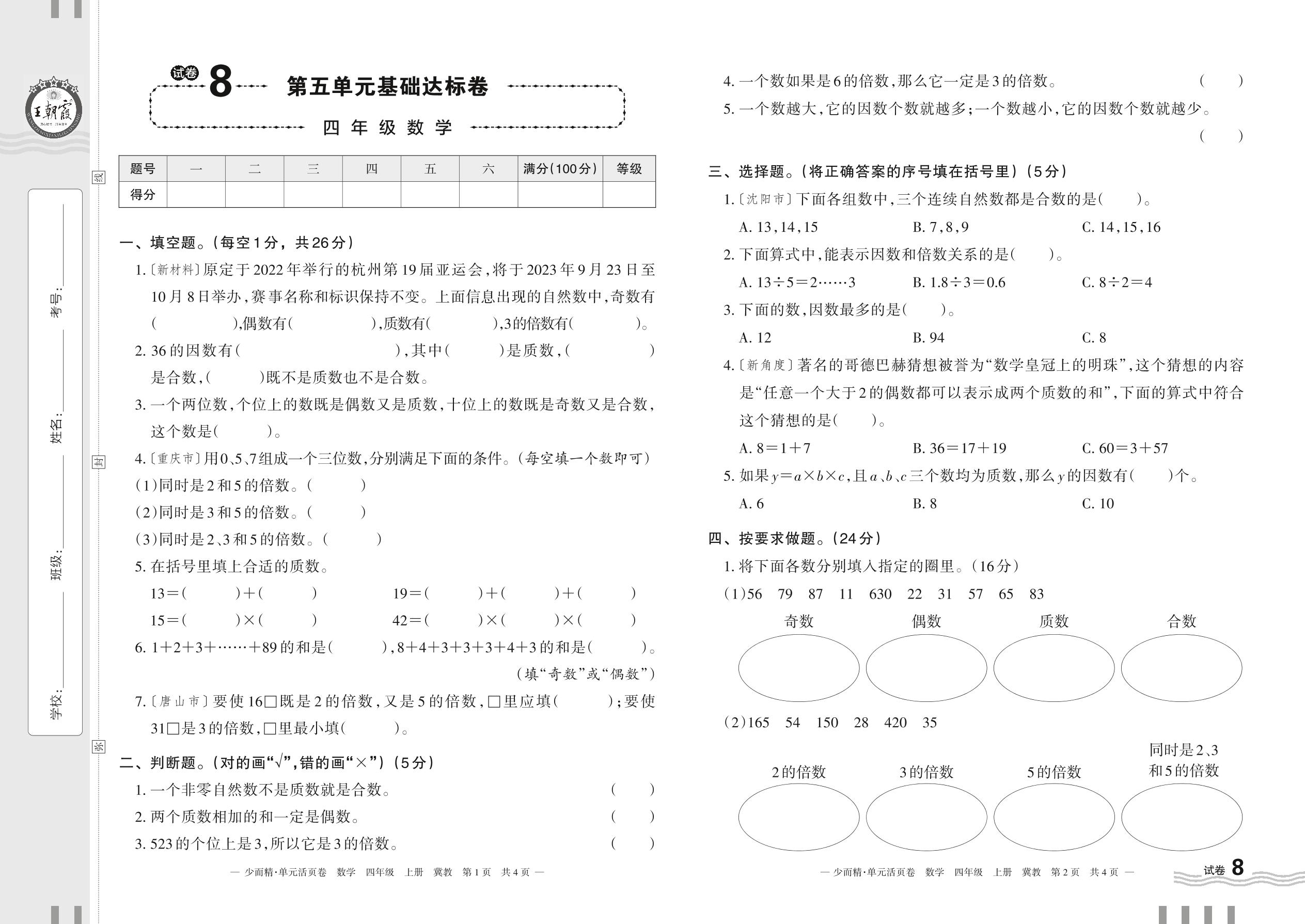 2023上册四年级数学冀教版 试卷8 第五单元基础达标卷