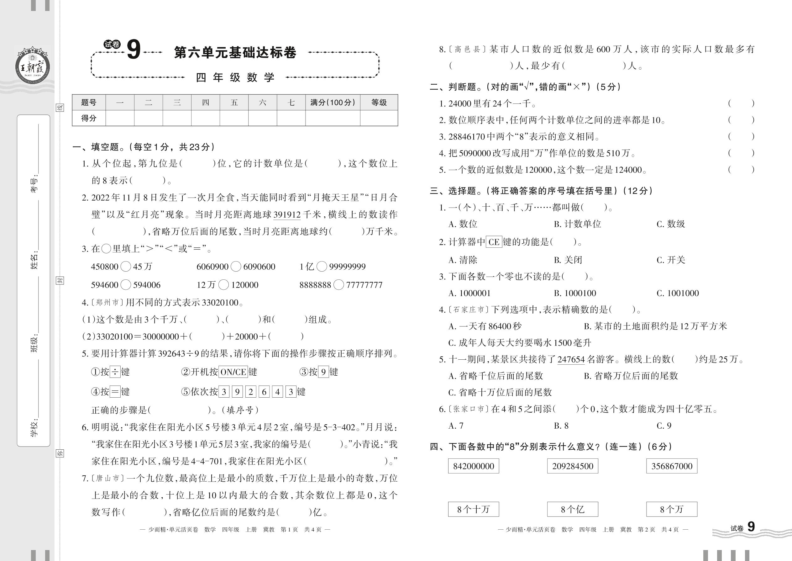 四年级数学冀教版上册单元卷