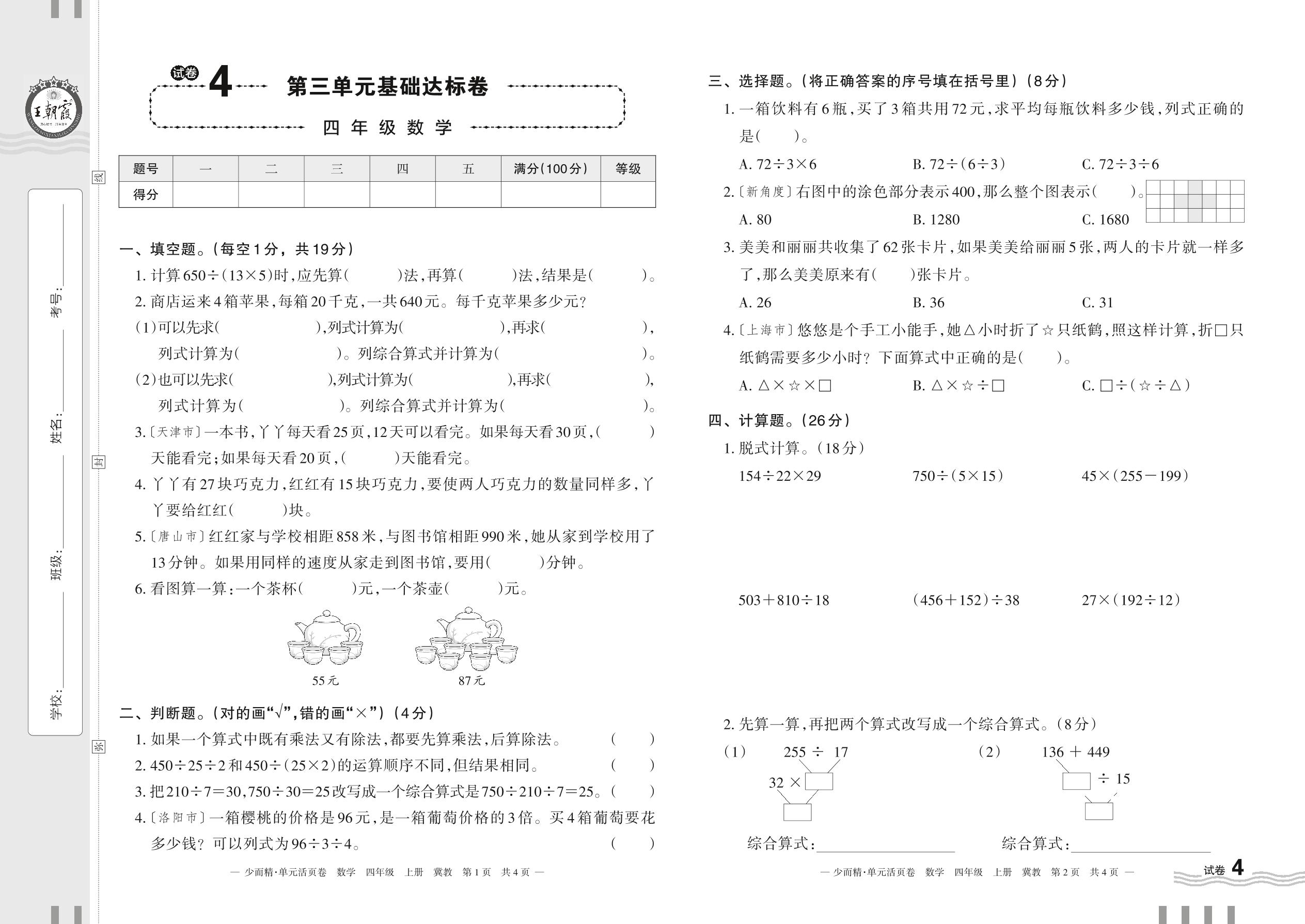 2023上册四年级数学冀教版 试卷4 第三单元基础达标卷