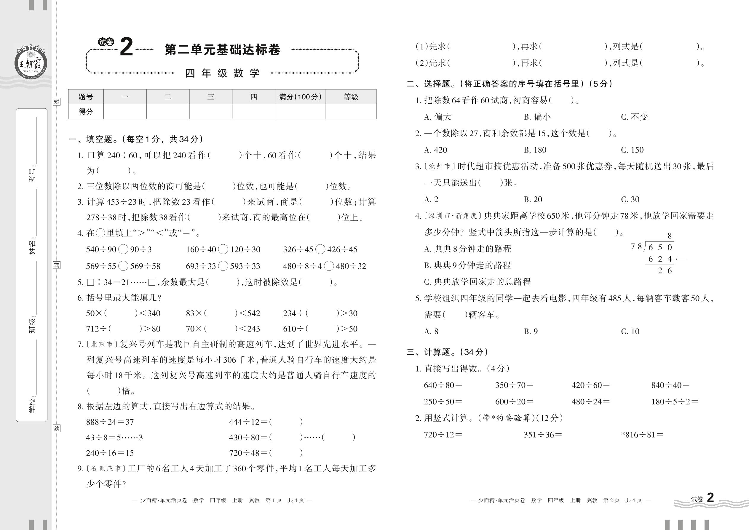2023上册四年级数学冀教版 试卷2 第二单元基础达标卷
