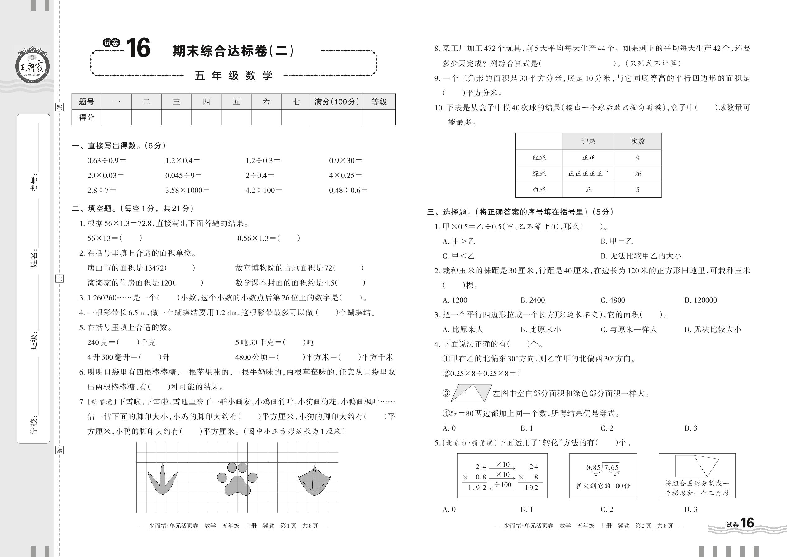 2023上册五年级数学冀教版 试卷16 期末综合达标卷(二)