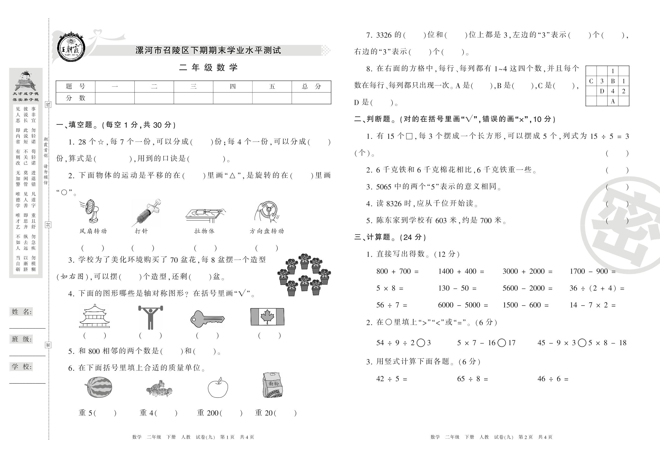 2015-2016学年第二学期漯河市召陵区二年级数学试卷(人教版)【9】