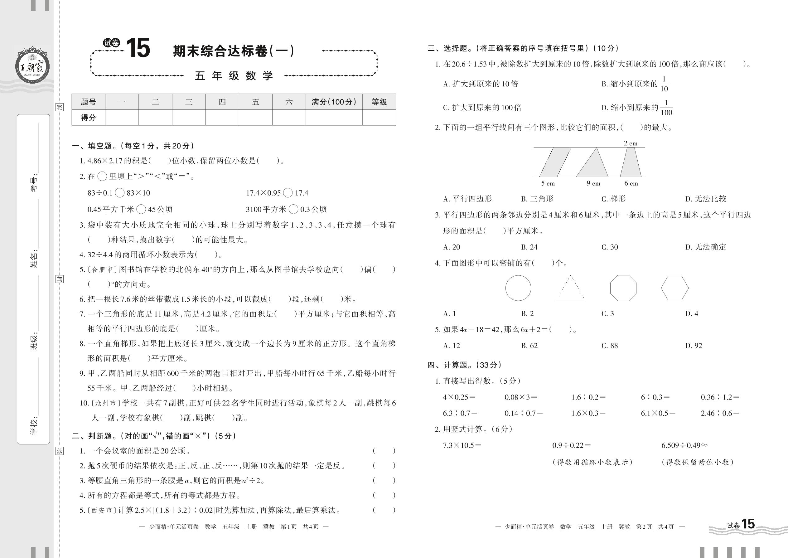 2023上册五年级数学冀教版 试卷15 期末综合达标卷(一)