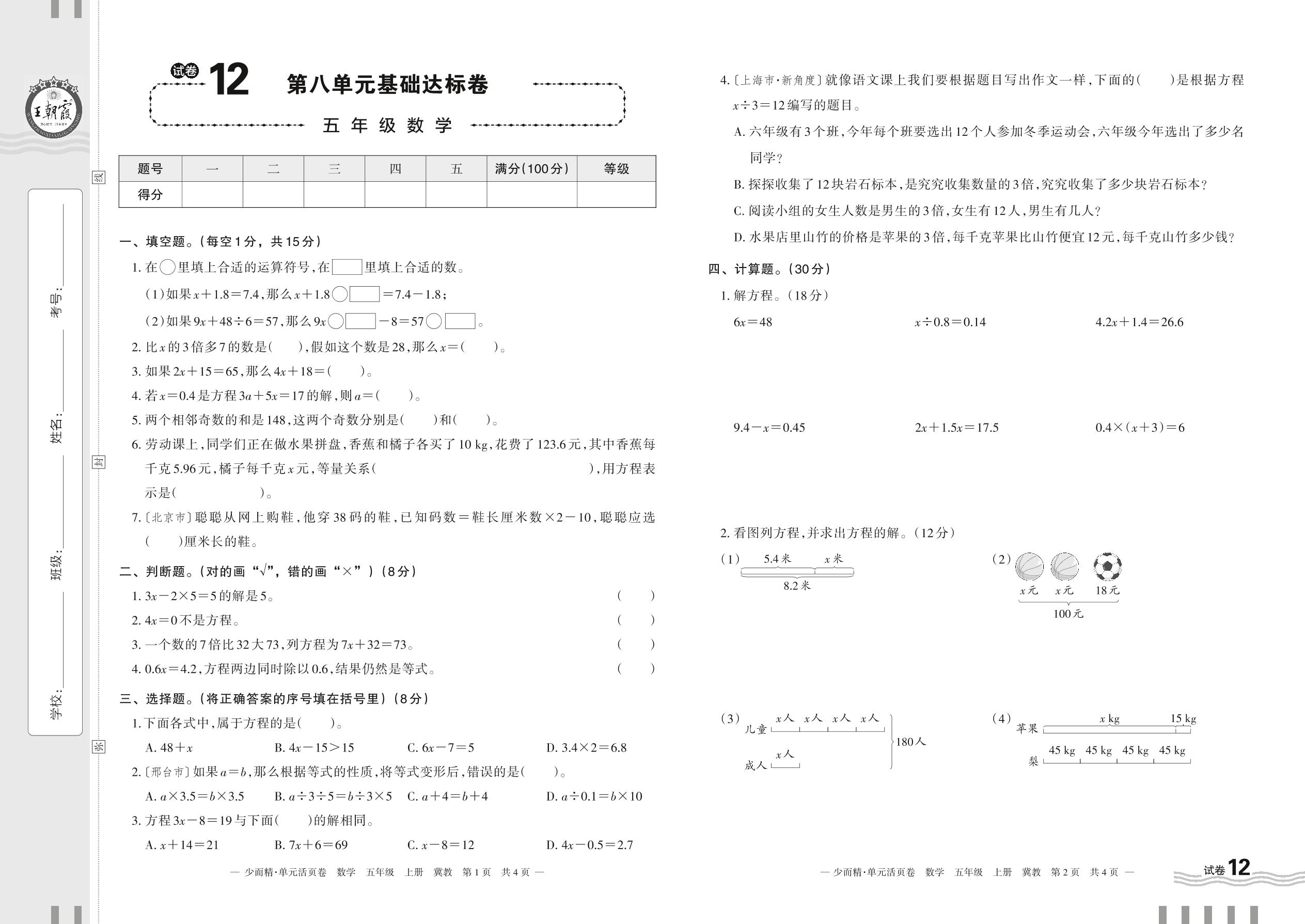 2023上册五年级数学冀教版 试卷12 第八单元基础达标卷
