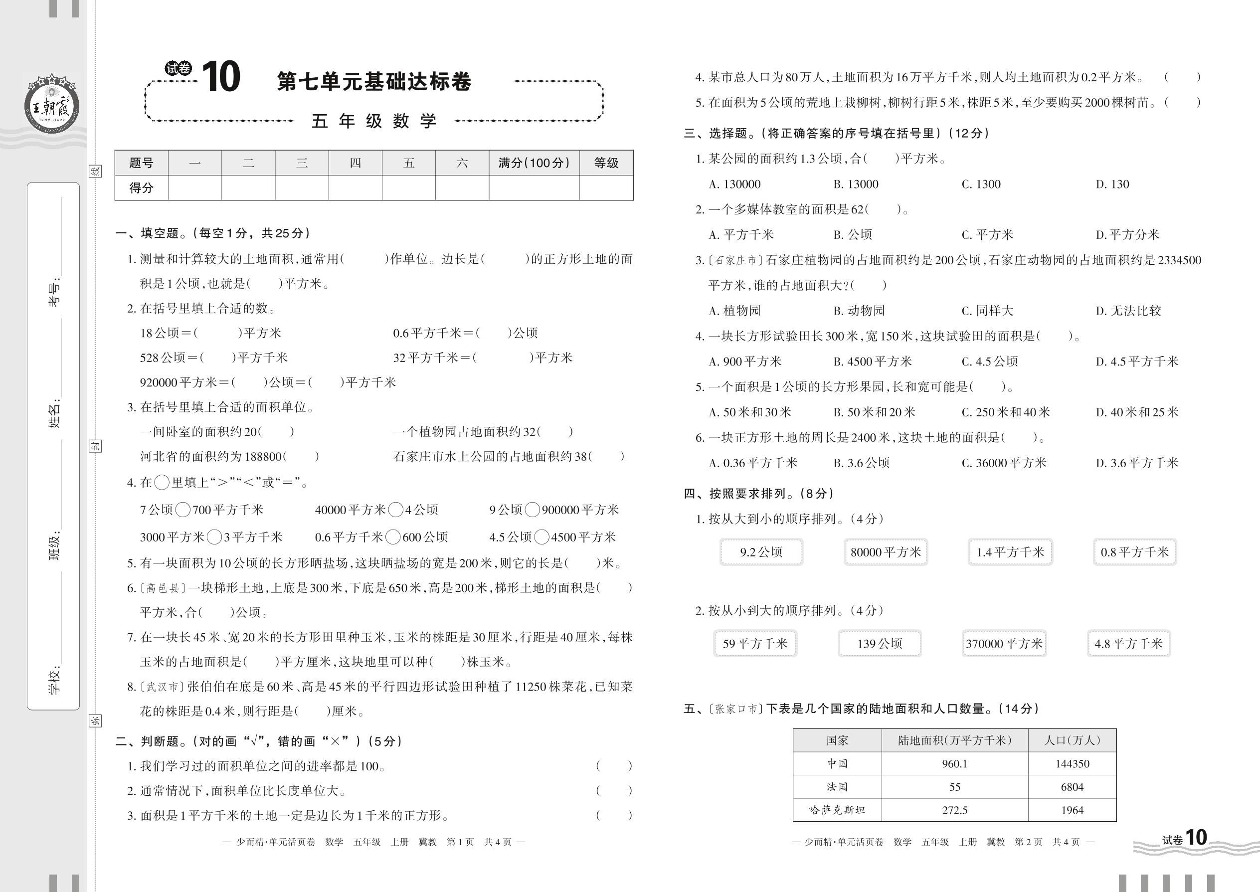 2023上册五年级数学冀教版 试卷10 第七单元基础达标卷