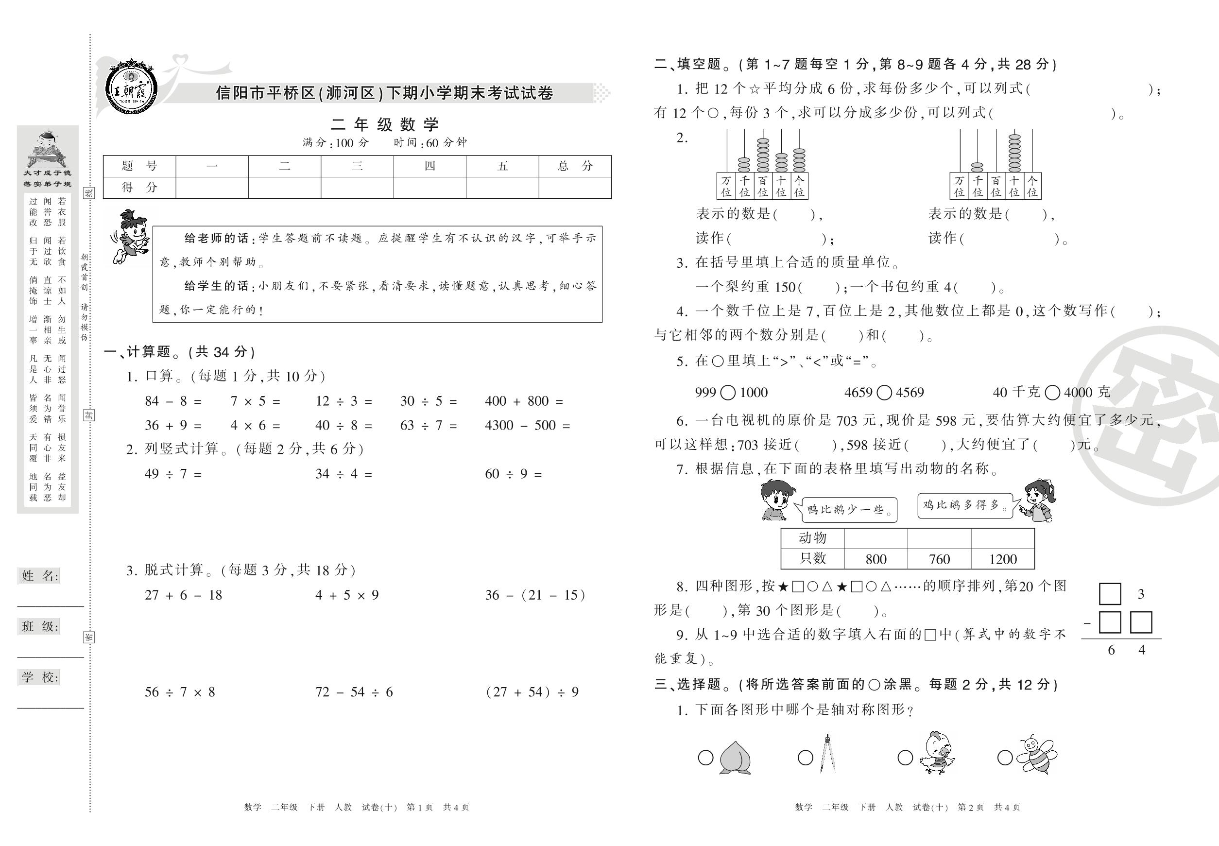 2015-2016学年第二学期信阳市平桥区(浉河区)二年级数学试卷(人教版)【10】