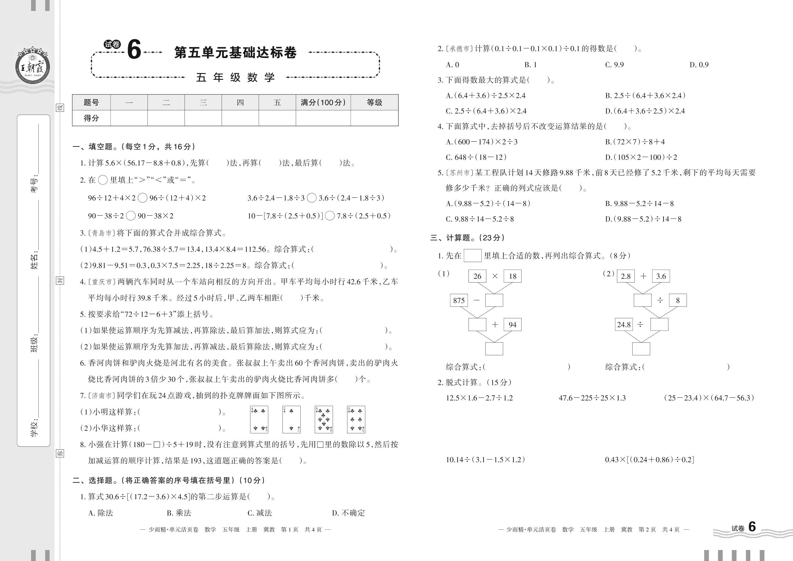 2023上册五年级数学冀教版 试卷6 第五单元基础达标卷
