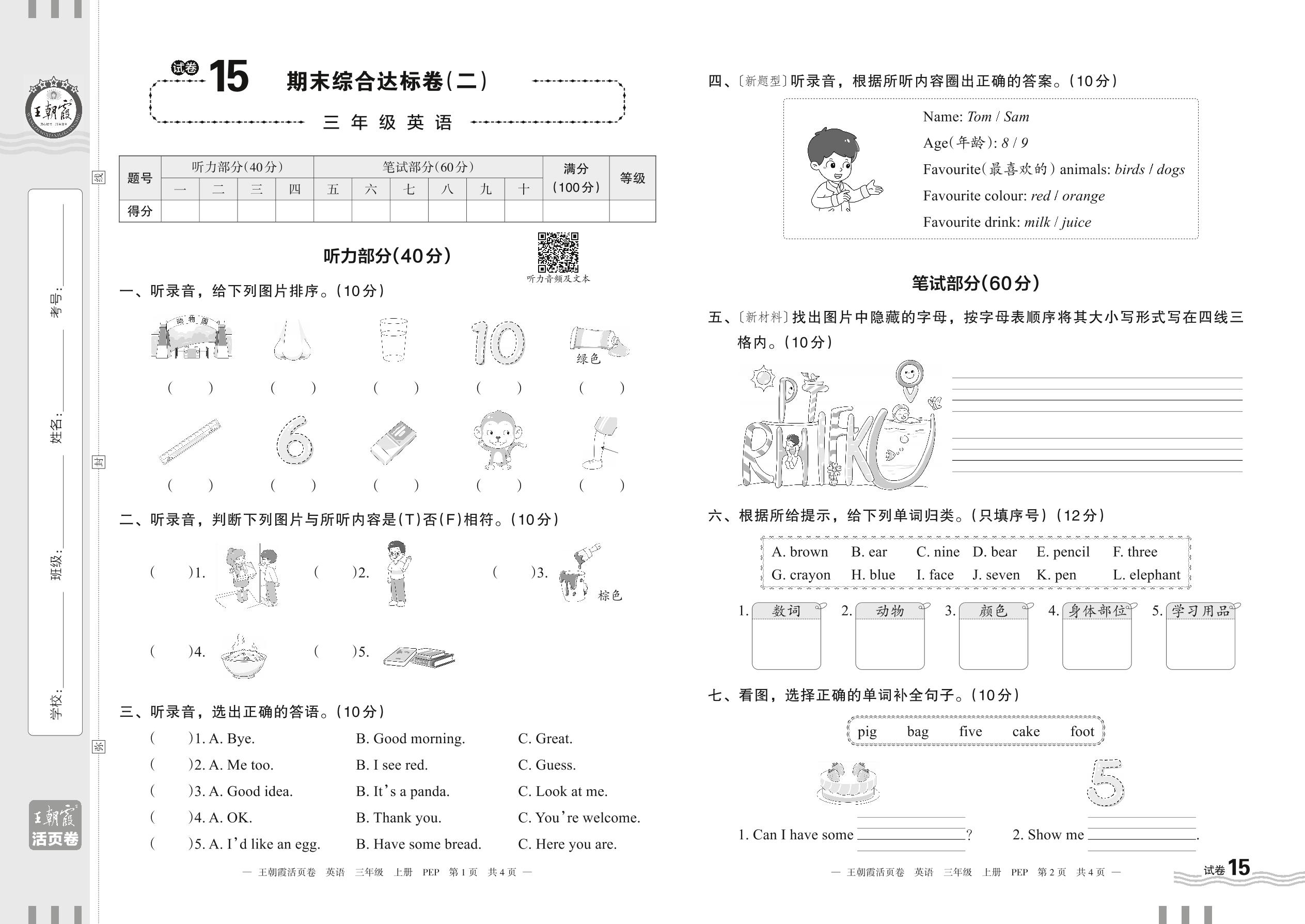 2023上册三年级英语人教PEP版 试卷15 期末综合达标卷(二)