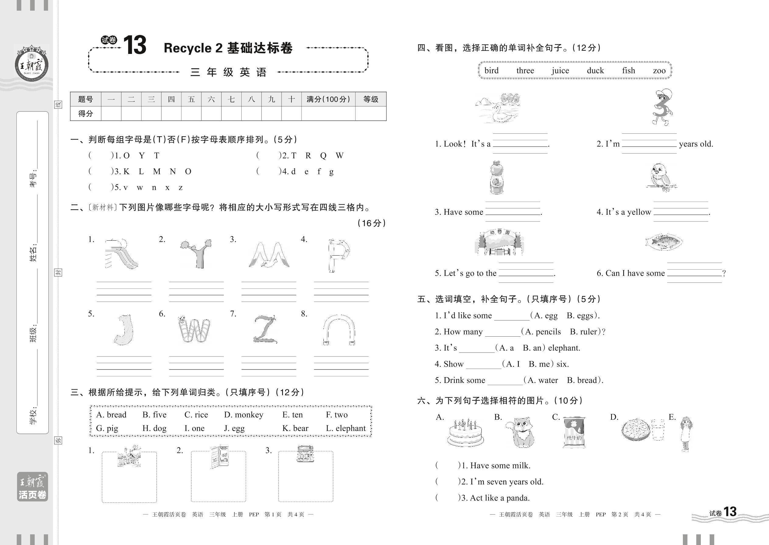 2023上册三年级英语人教PEP版 试卷13 Recycle 2 基础达标卷