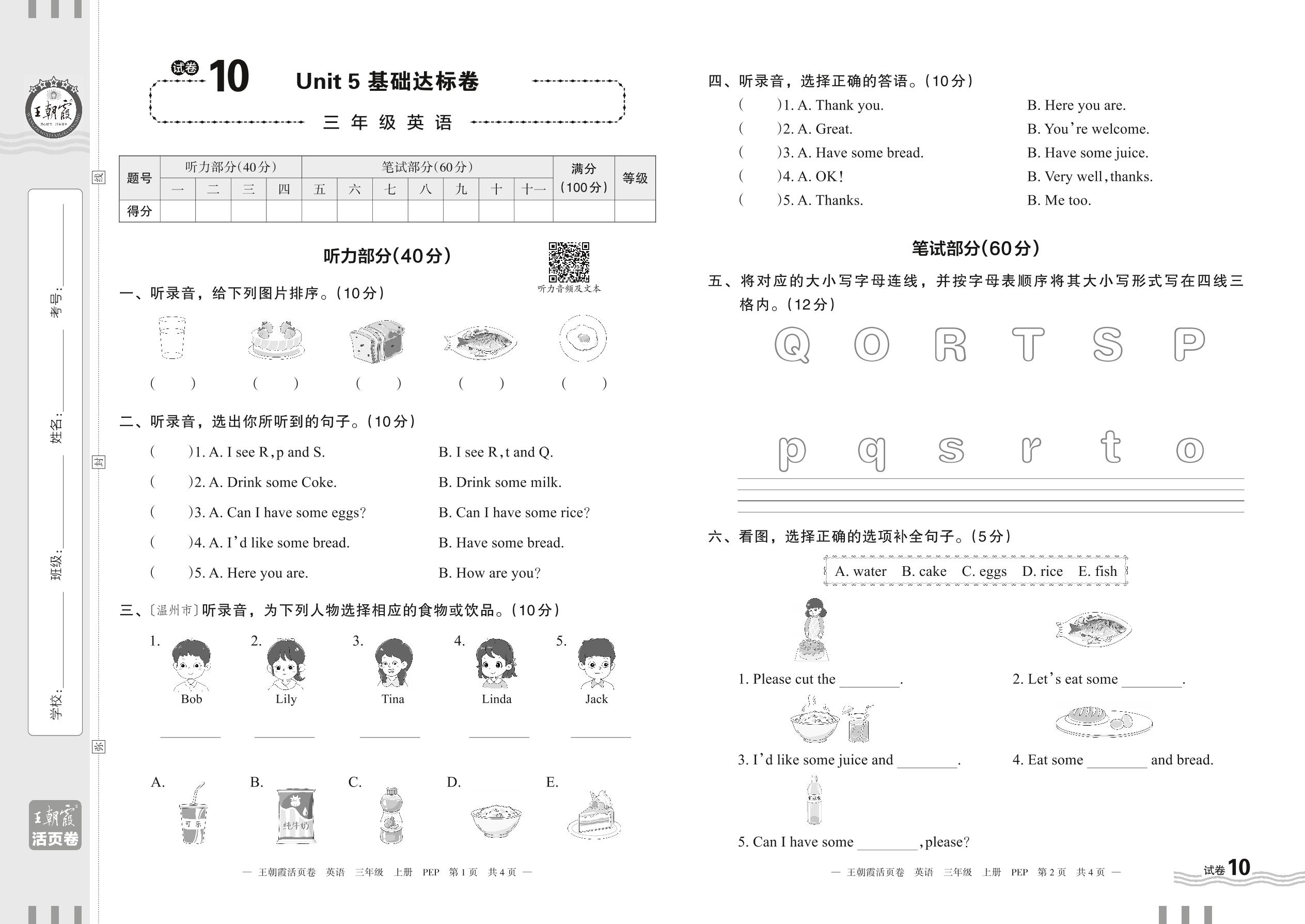 2023上册三年级英语人教PEP版 试卷10 Unit 5 基础达标卷