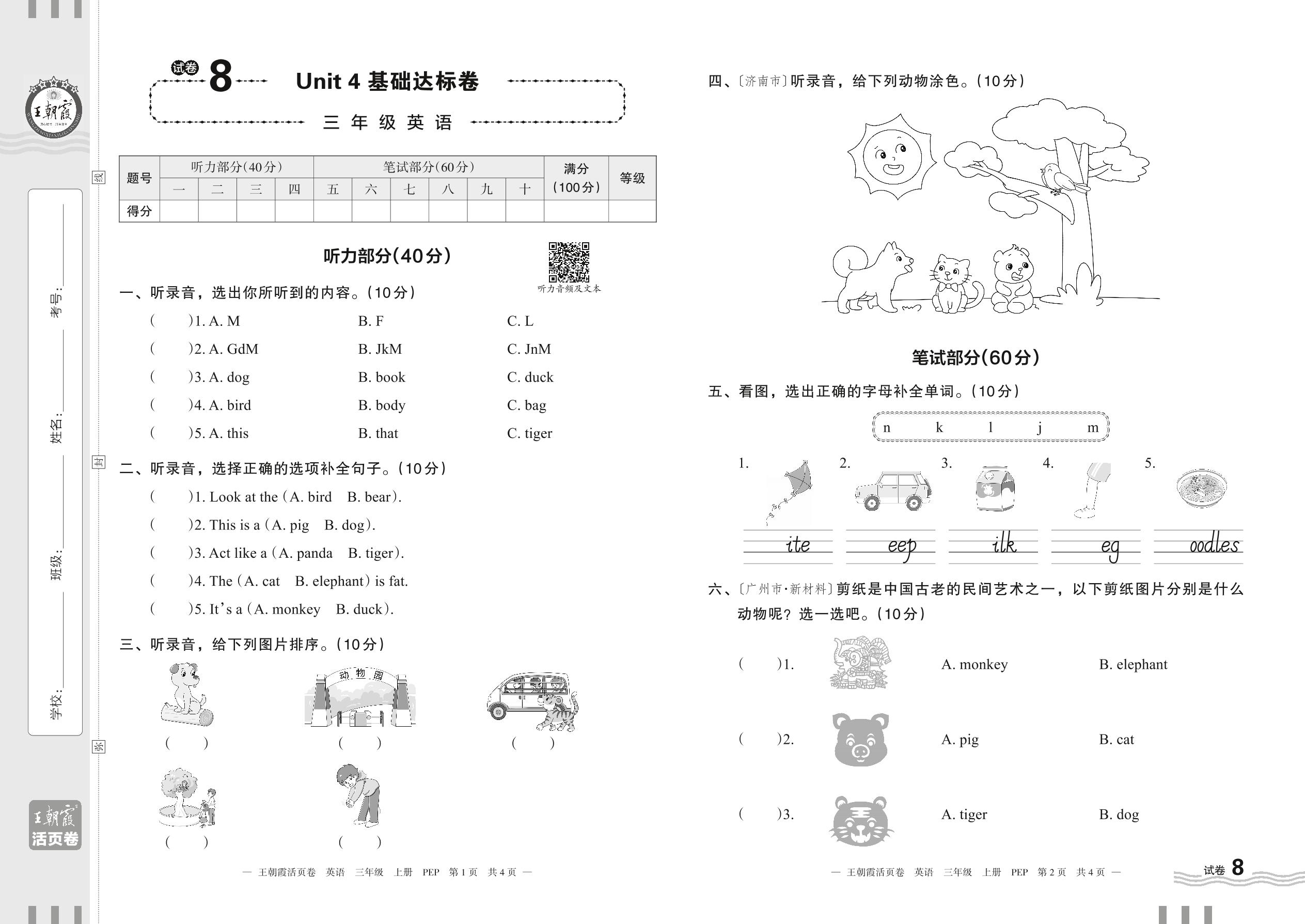 2023上册三年级英语人教PEP版 试卷8 Unit 4 基础达标卷