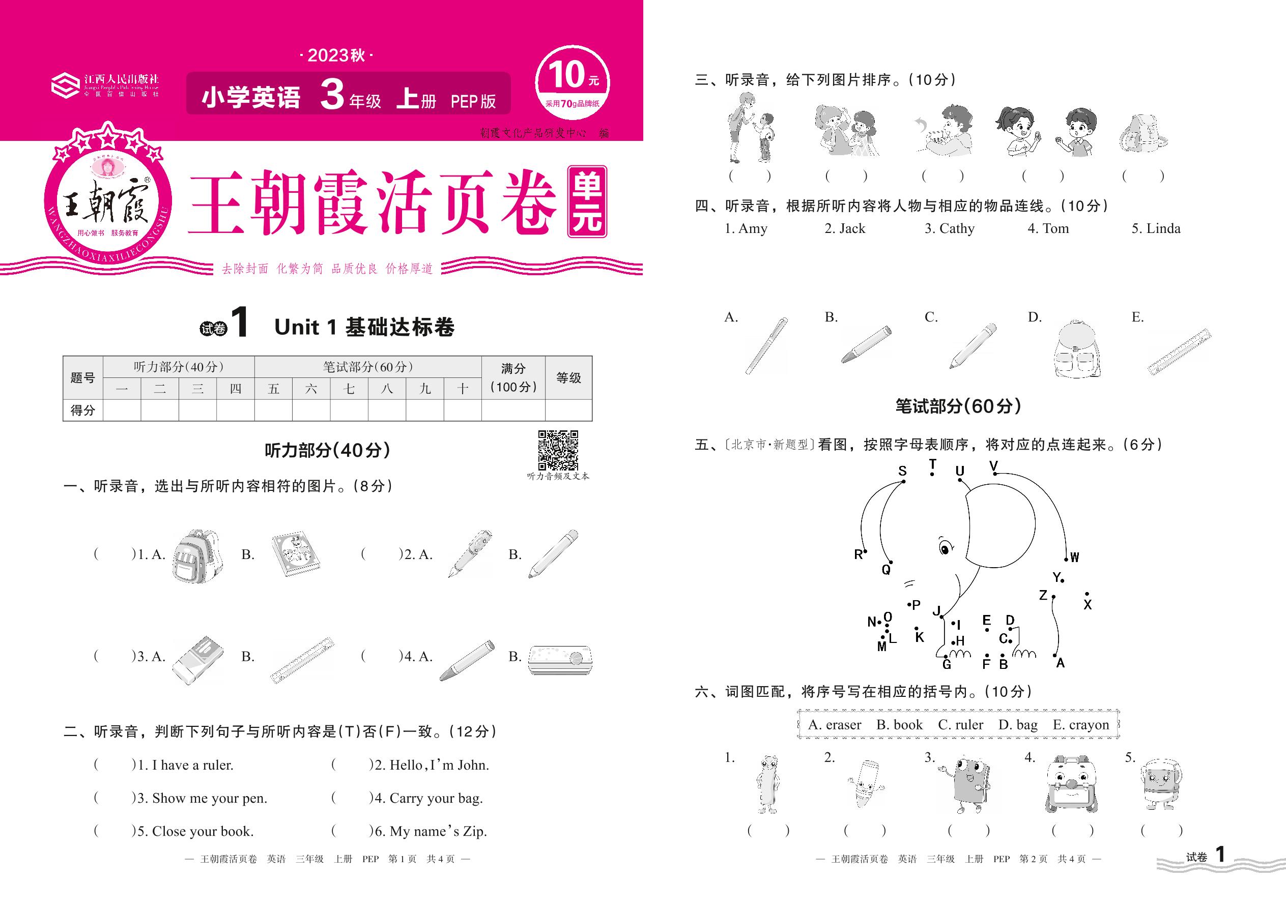 2023上册三年级英语人教PEP版 试卷1 Unit 1 基础达标卷