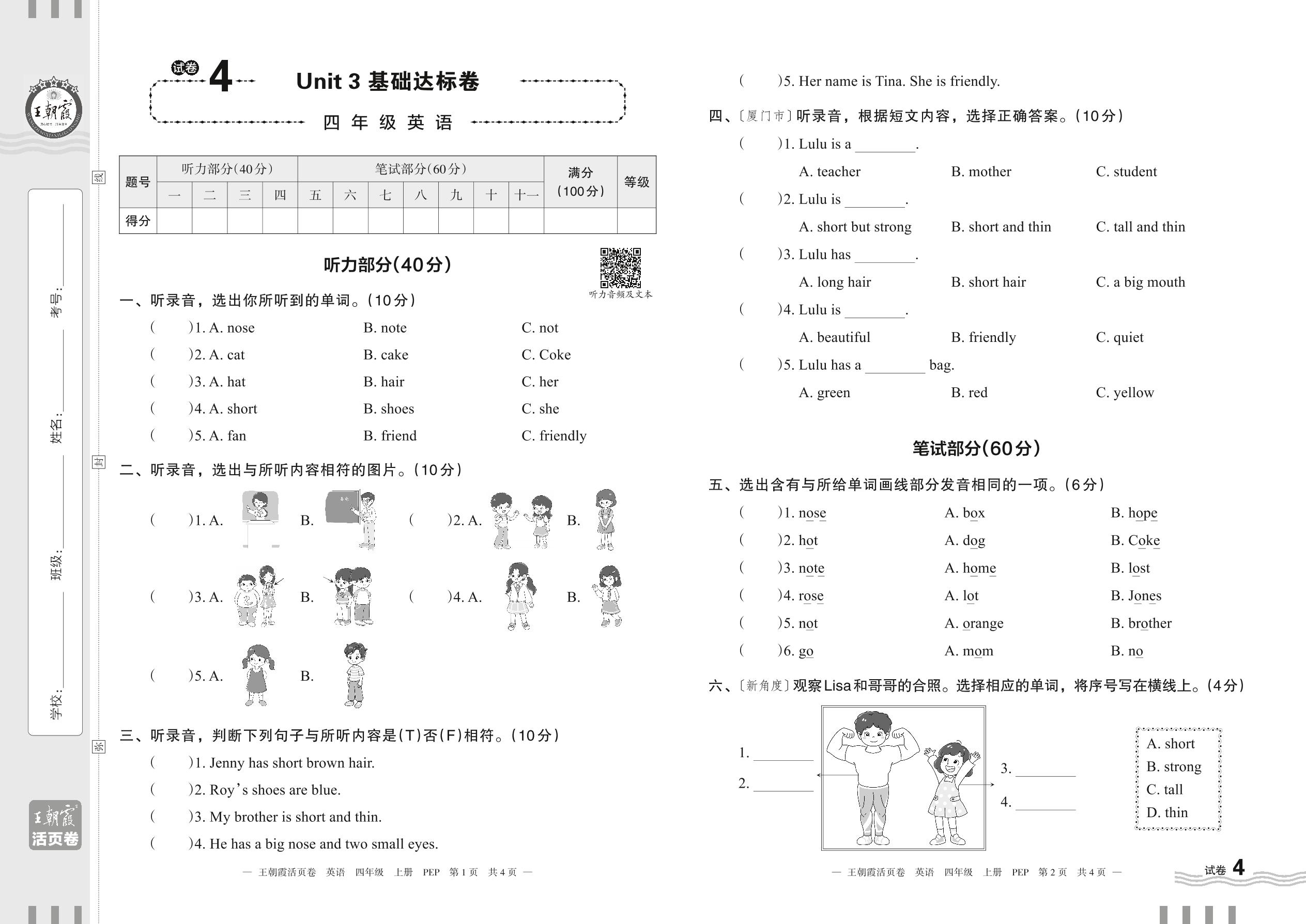 2023上册四年级英语人教PEP版 试卷4 Unit 3 基础达标卷