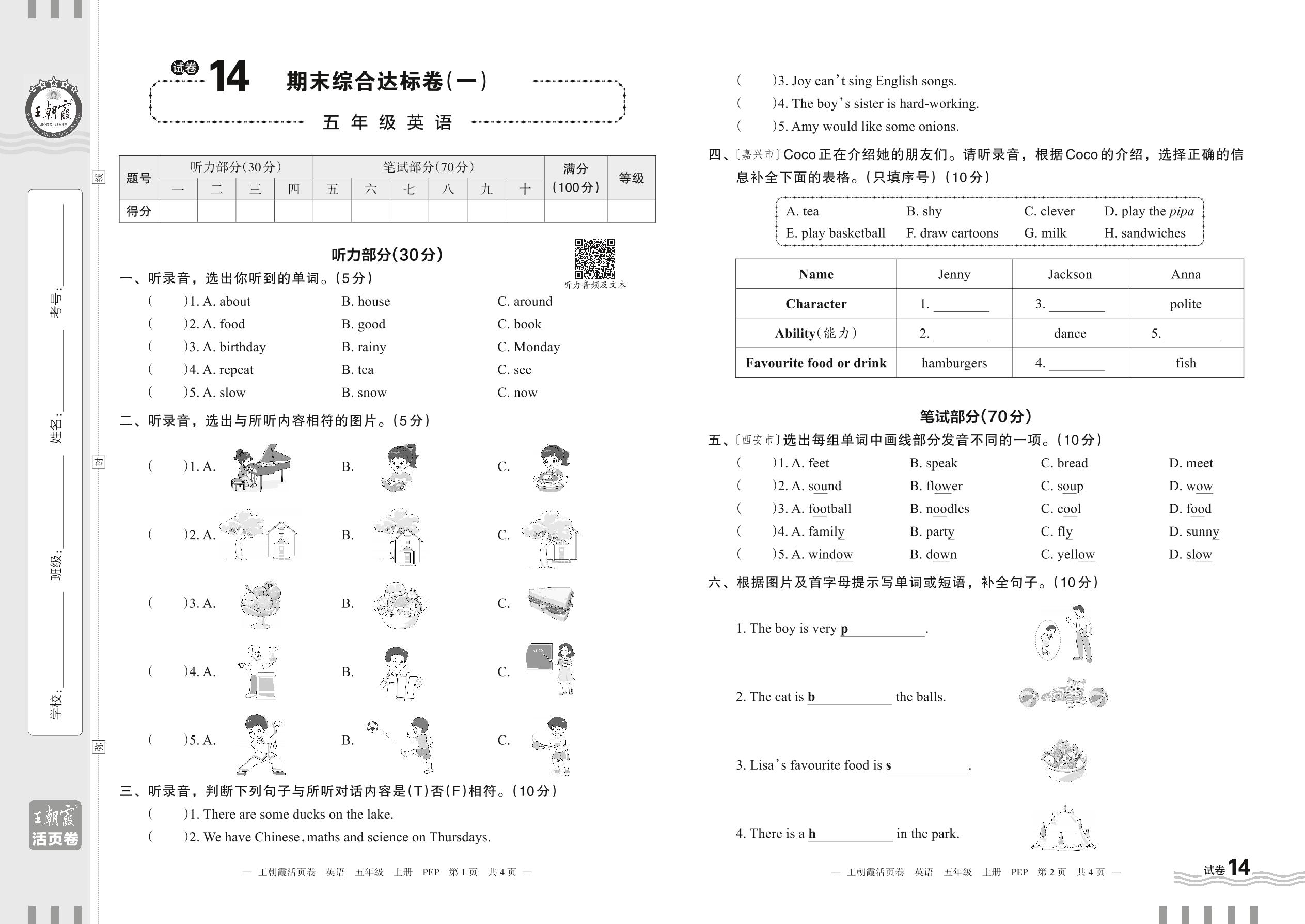 2023上册五年级英语人教PEP版 试卷14 期末综合达标卷(一)