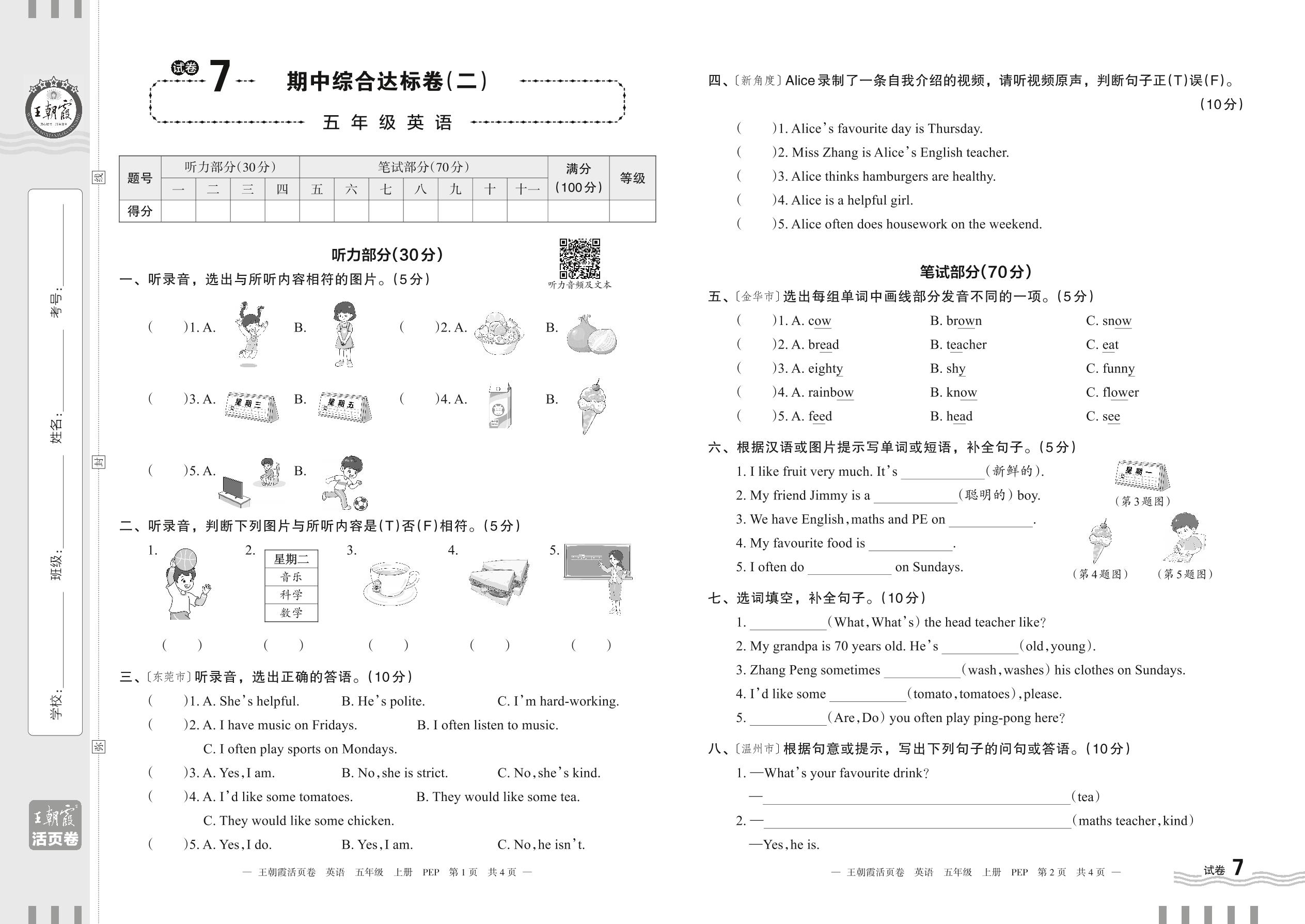 2023上册五年级英语人教PEP版 试卷7 期中综合达标卷(二)
