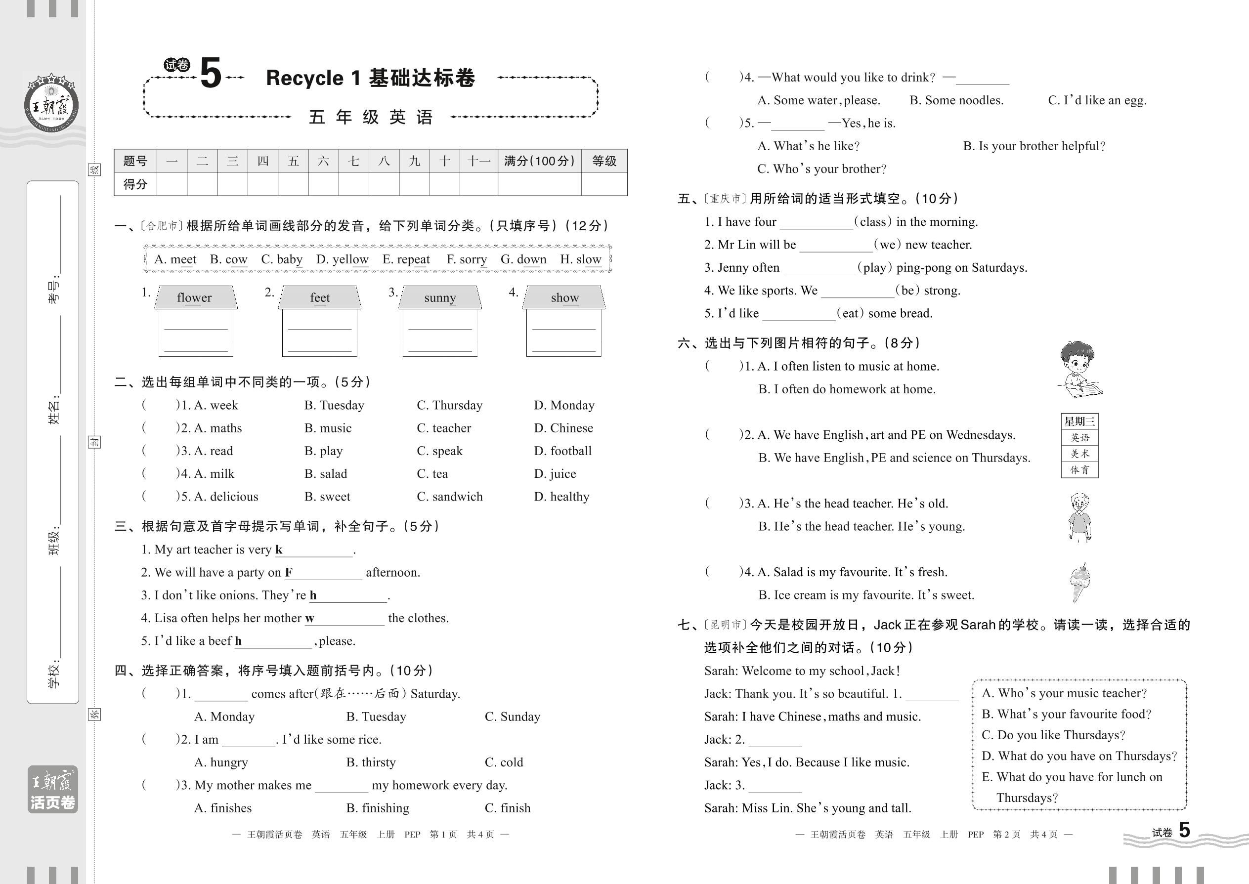 2023上册五年级英语人教PEP版 试卷5 Recycle 1 基础达标卷