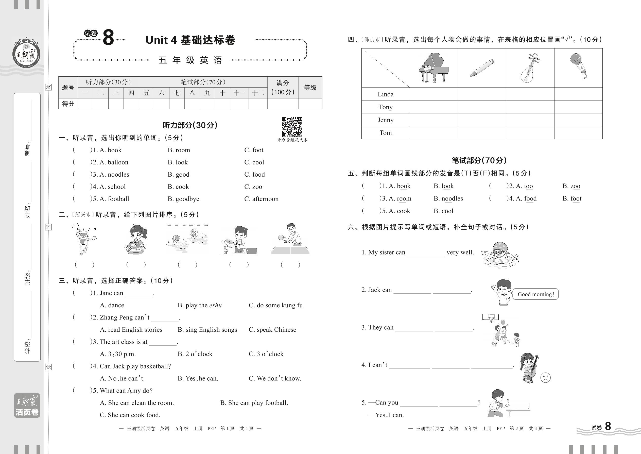 2023上册五年级英语人教PEP版 试卷8 Unit 4 基础达标卷