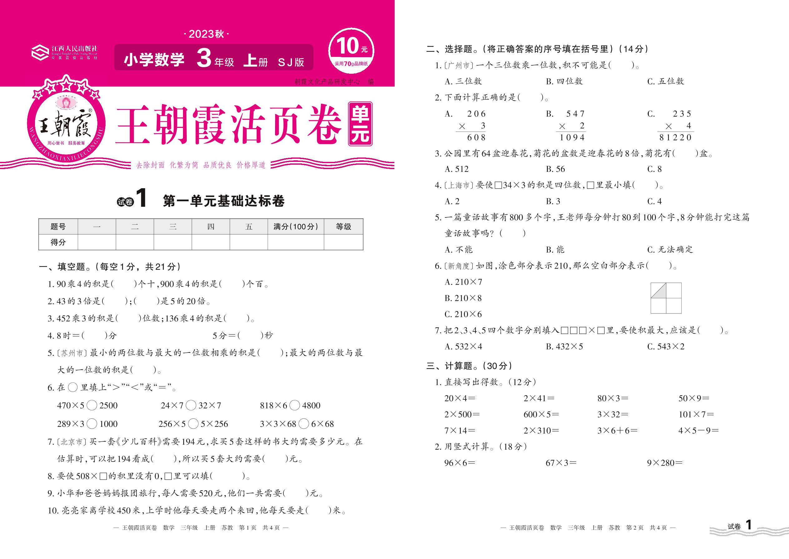 2023上册三年级数学苏教版 试卷1 第一单元基础达标卷
