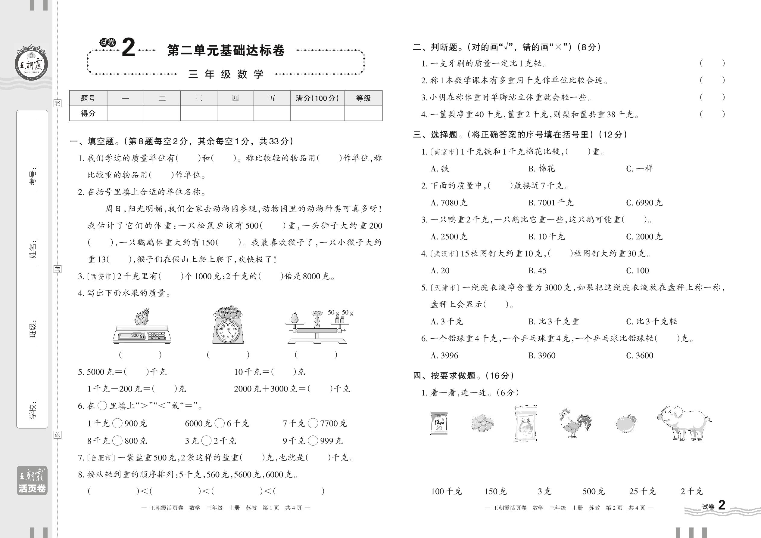 2023上册三年级数学苏教版 试卷2 第二单元基础达标卷