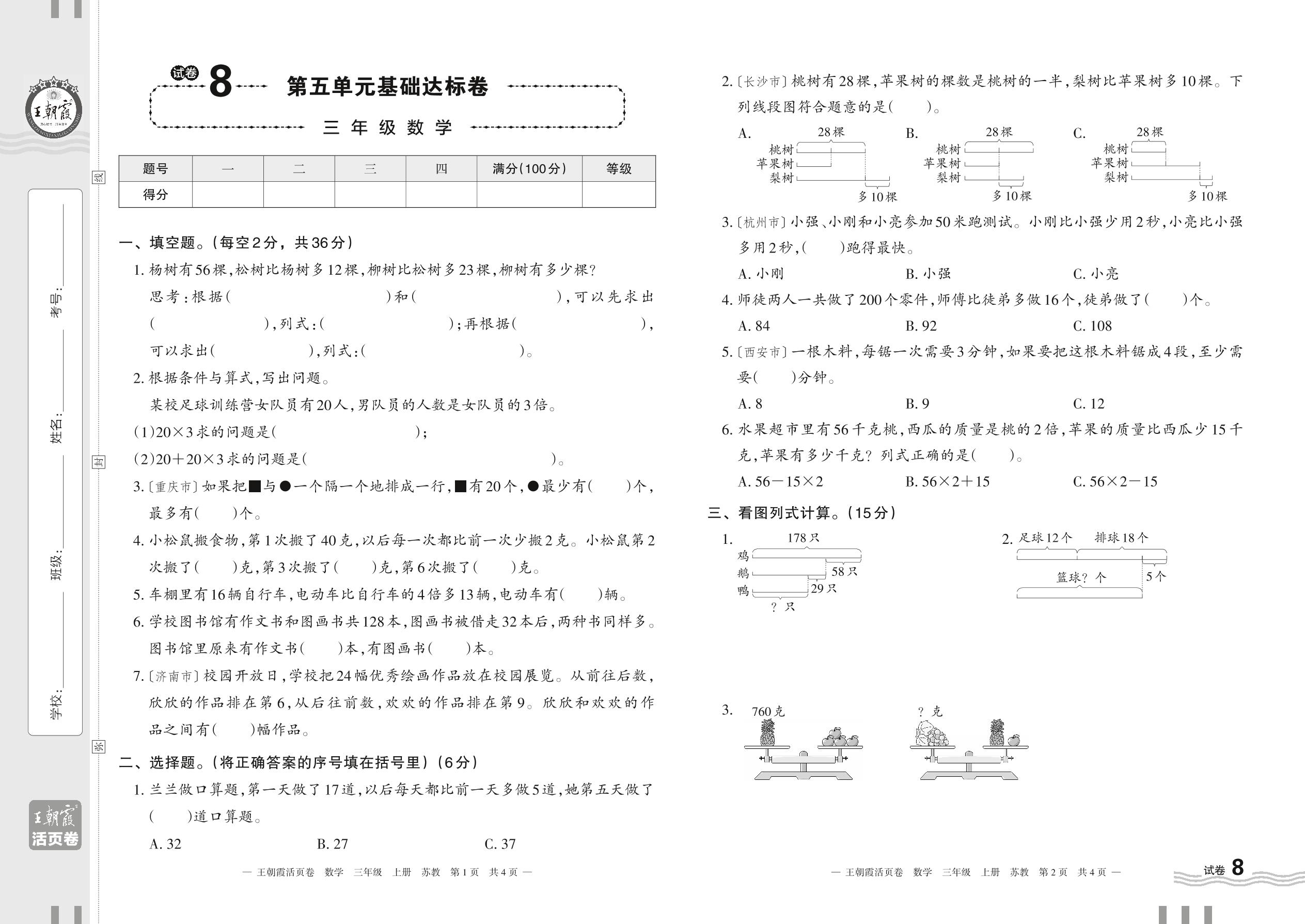 2023上册三年级数学苏教版 试卷8 第五单元基础达标卷