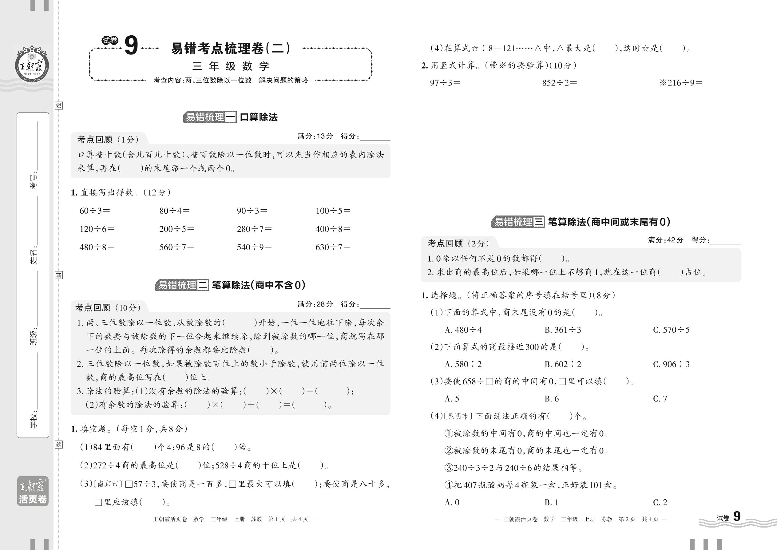2023上册三年级数学苏教版 试卷9 易错考点梳理卷(二)