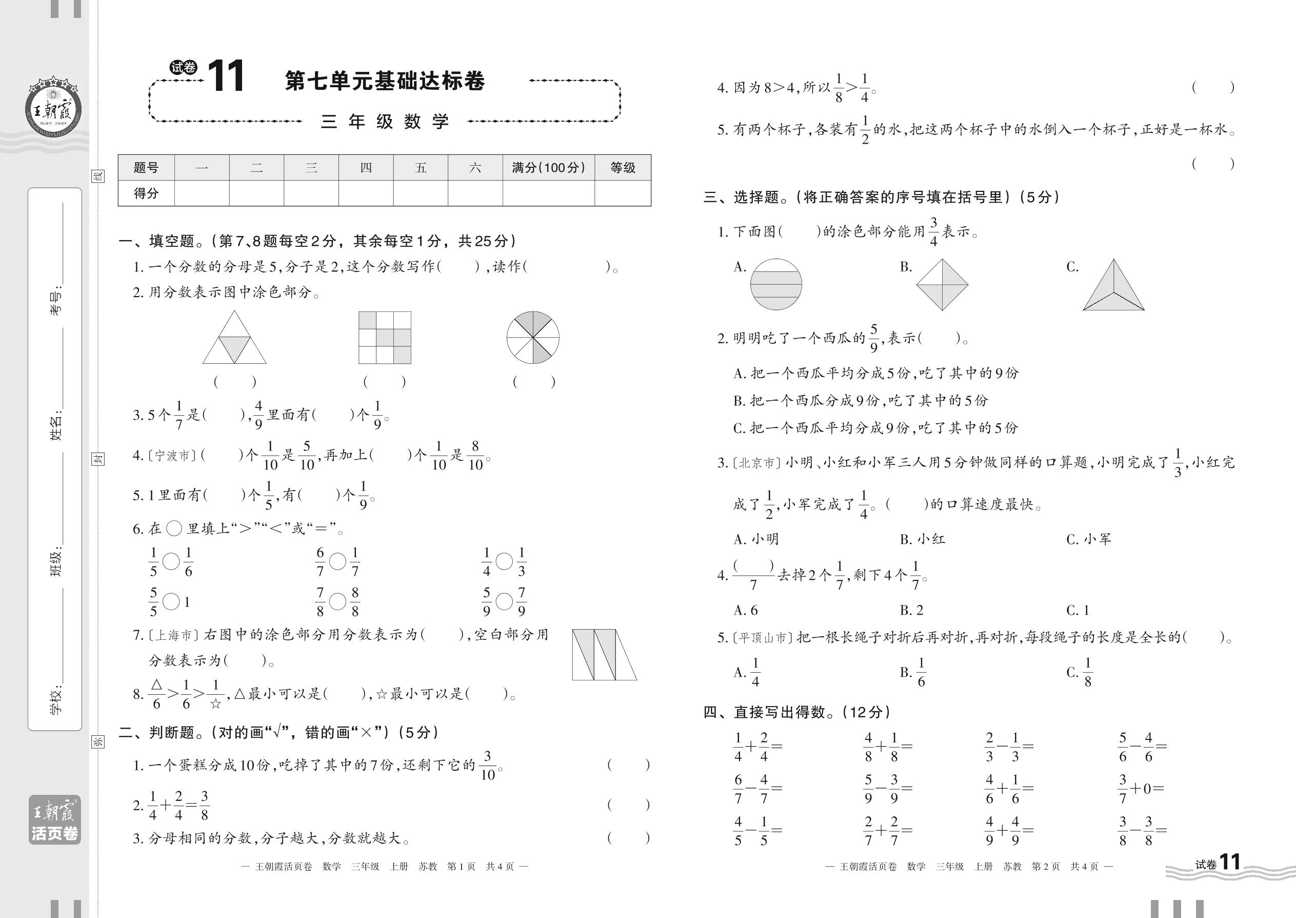 2023上册三年级数学苏教版 试卷11 第七单元基础达标卷