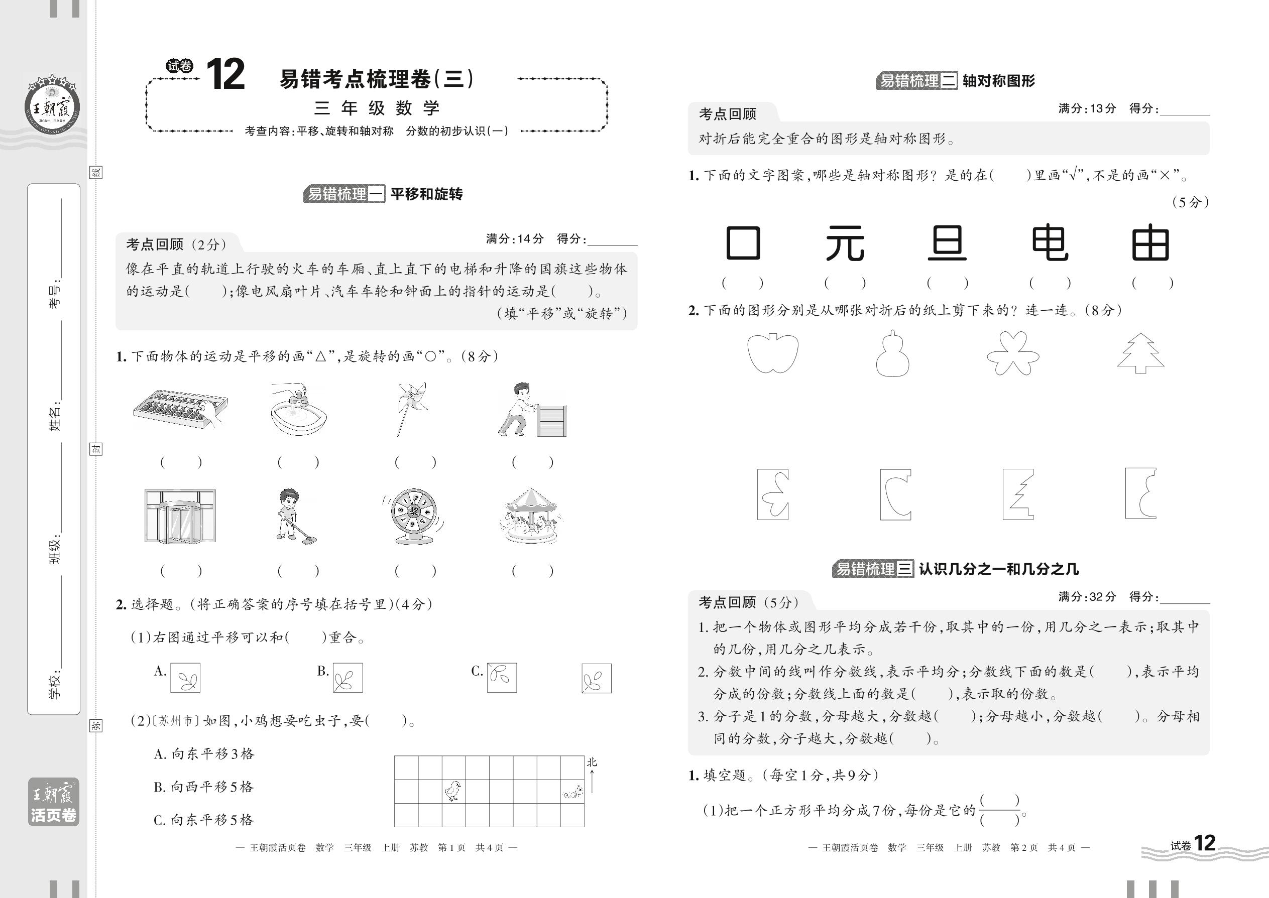 2023上册三年级数学苏教版 试卷12 易错考点梳理卷(三)