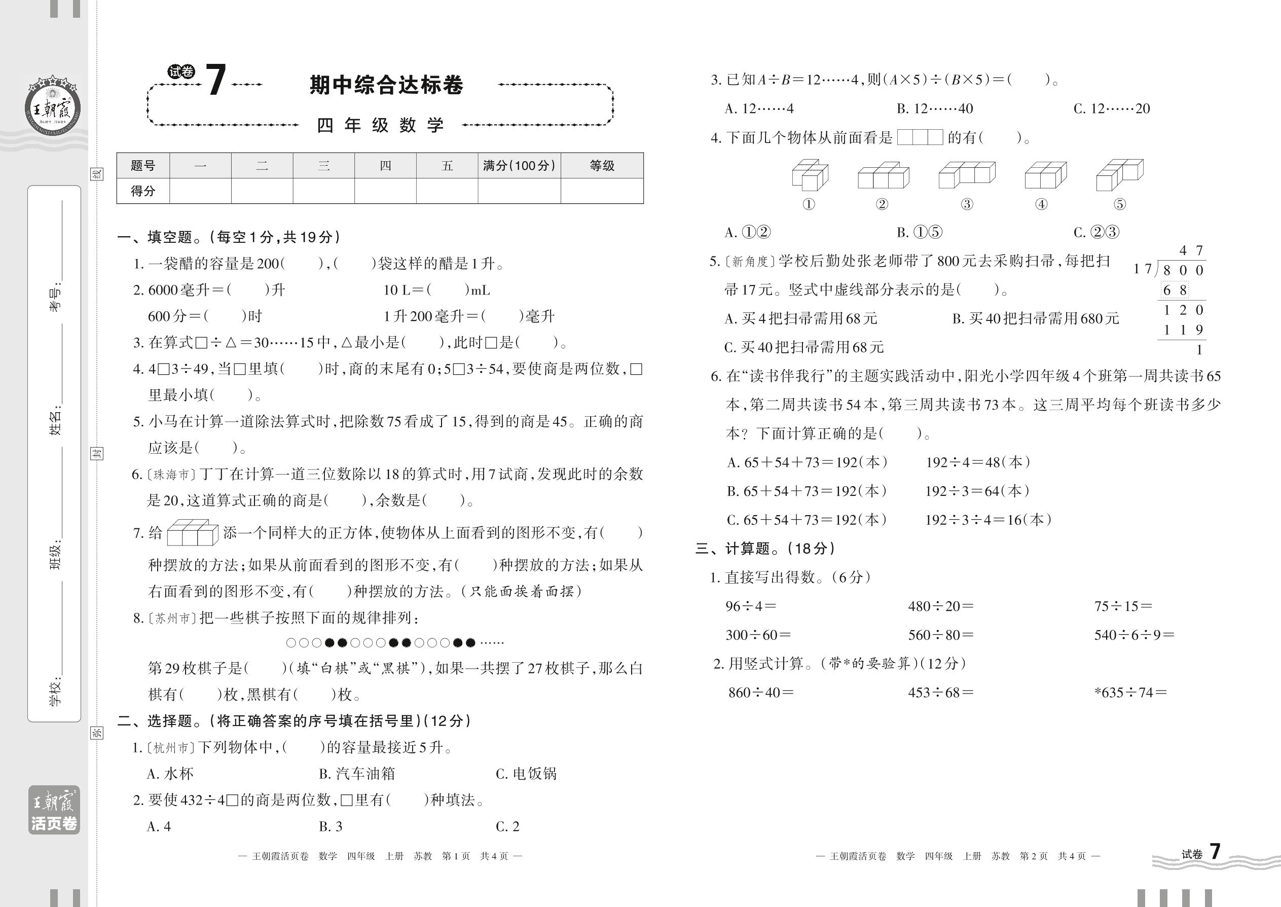 2023上册四年级数学苏教版 试卷7 期中综合达标卷