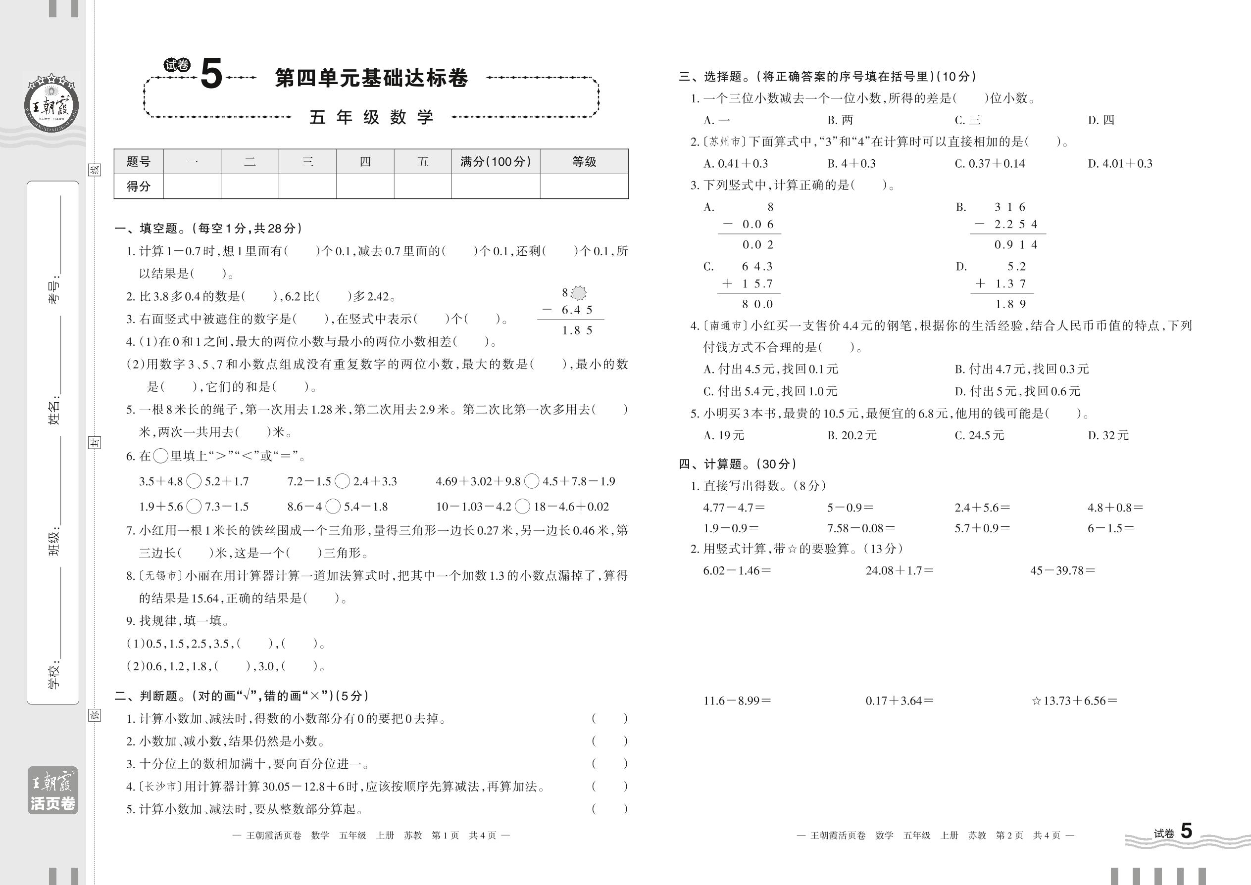 2023上册五年级数学苏教版 试卷5 第四单元基础达标卷