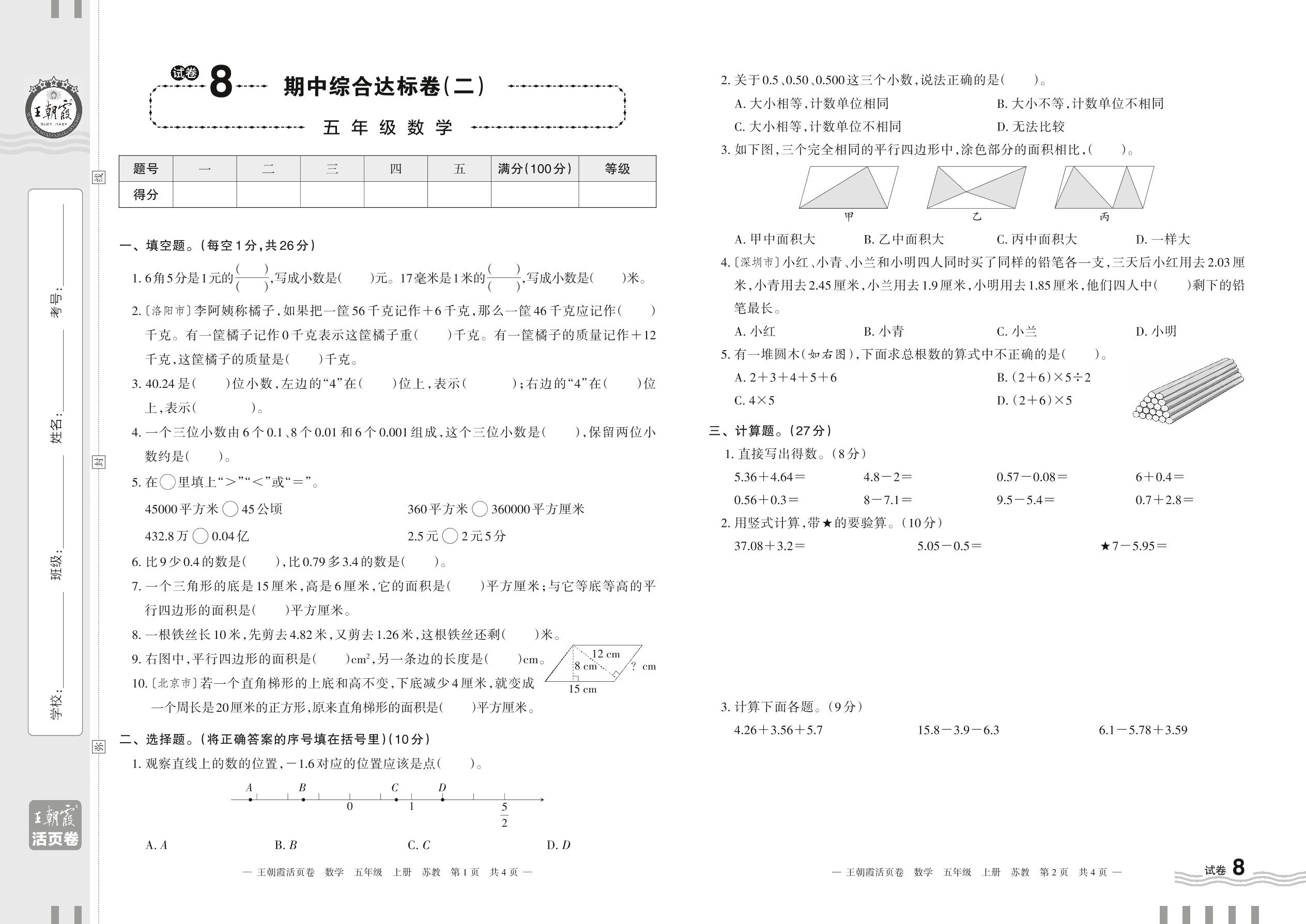 2023上册五年级数学苏教版 试卷8 期中综合达标卷(二)