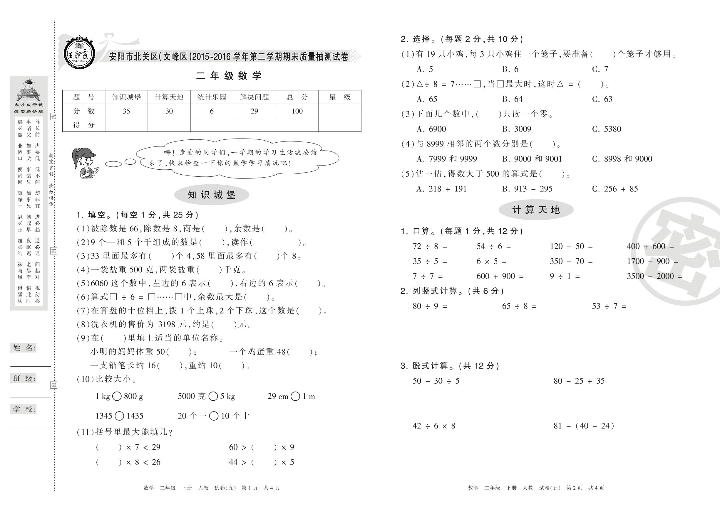 2015-2016学年第二学期安阳市北关区(文峰区)二年级数学试卷(人教版)【5】