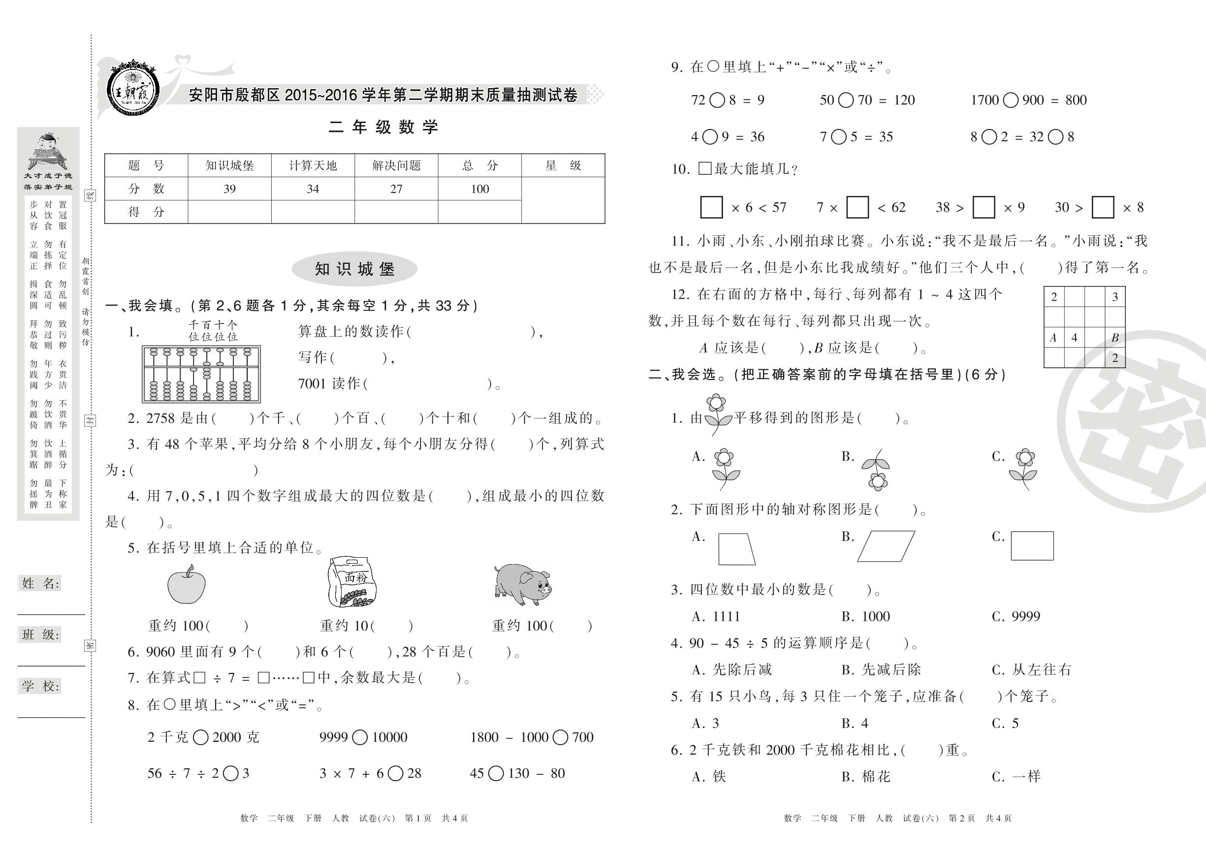 2015-2016学年第二学期安阳市殷都区二年级数学试卷(人教版)【6】