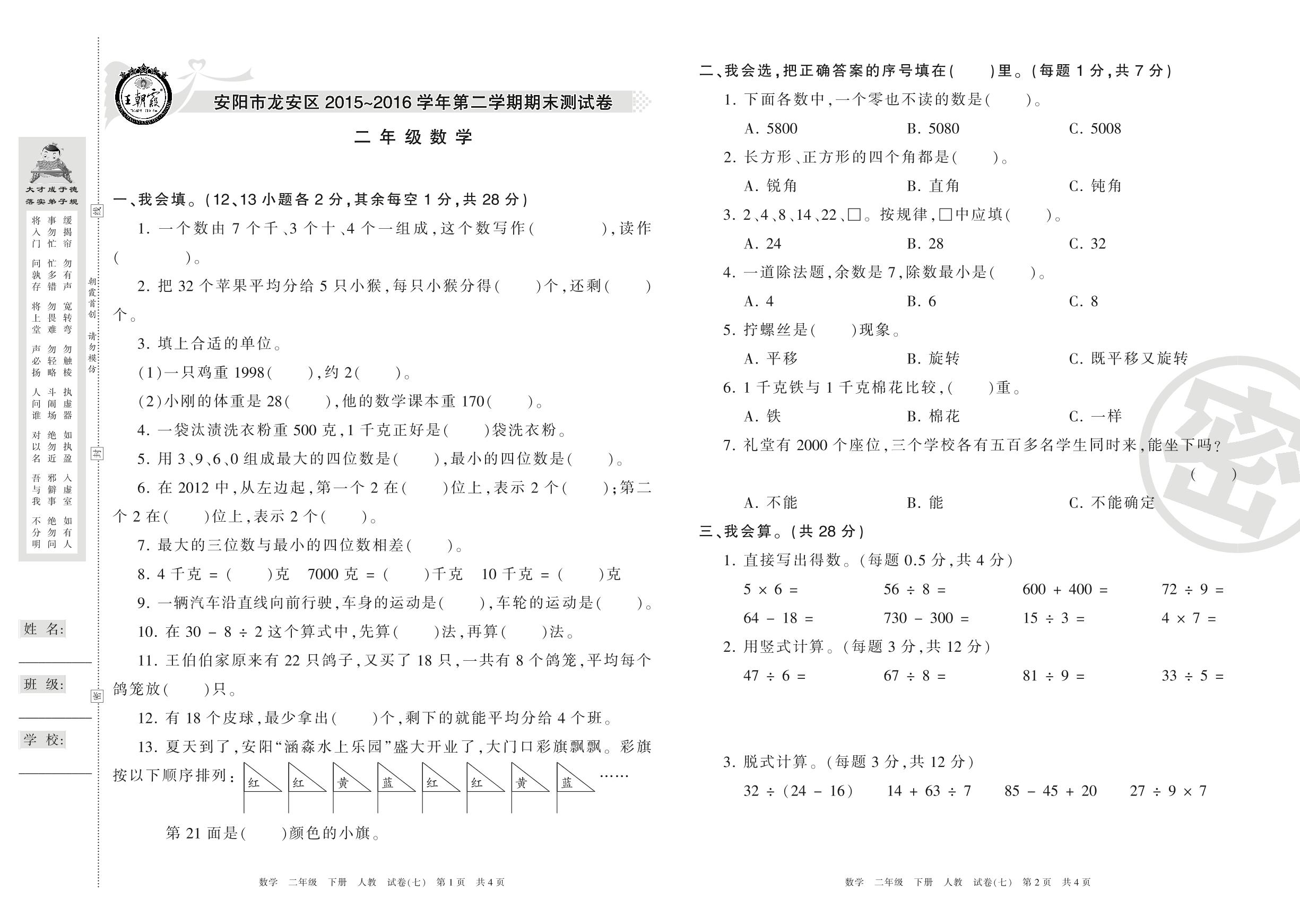2015-2016学年第二学期安阳市龙安区二年级数学试卷(人教版)【7】