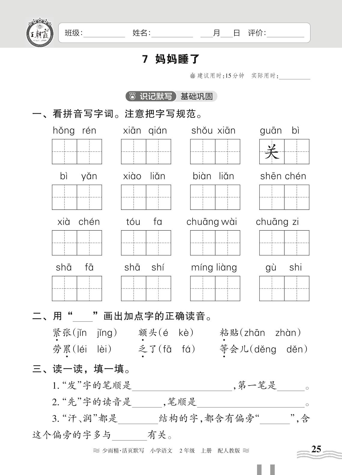 2023上册二年级语文人教版 第三单元——7 妈妈睡了