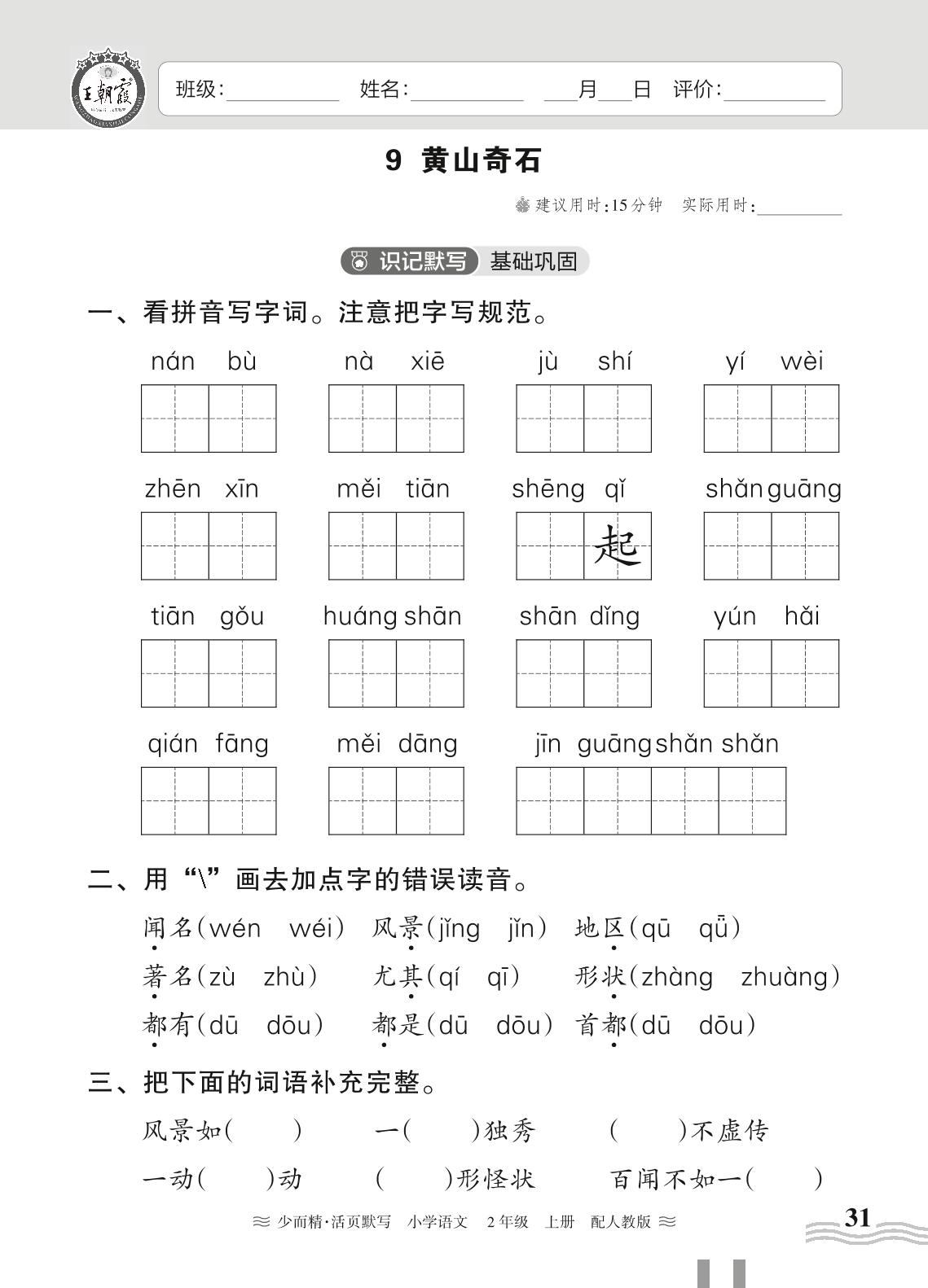 2023上册二年级语文人教版 第四单元——9 黄山奇石