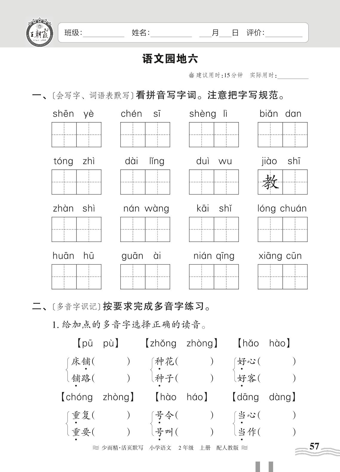 二年级语文人教版上册课时作业