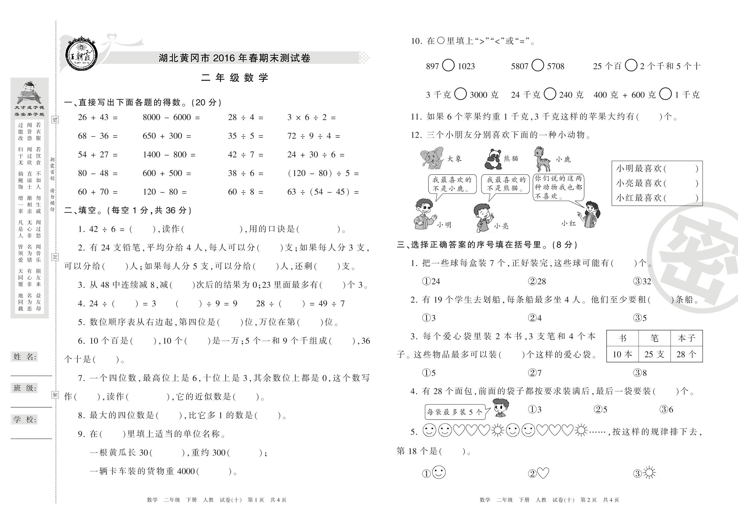 2015-2016学年第二学期湖北黄冈市二年级数学试卷(人教版)【10】